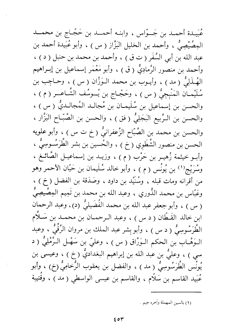عُبَيدة أَحْمَد بْن جواس، وابنه أَحْمَد بْن حجاج بْن مُحَمَّد المصيصي، وأحمد بْن الخليل البزاز (س) ، وأَبُو عُبَيدة أَحْمَد بْن عَبد اللَّهِ بن أَبي السفر (ت ق) ، وأحمد بْن مُحَمَّدِ بْن حنبل (د) ، وأحمد بْن منصور الرمادي (ق) ، وأَبُو معمر إسماعيل بْن إبراهيم الهذلي (مد) ، وأيوب بْن مُحَمَّد الوزان (س) ، وحاجب بْن سُلَيْمان المنبجي (س) ، وحجاج بْن يوسف الشاعر (م) ، والحسن بْن إِسْمَاعِيلَ بْن سُلَيْمان بْن مجالد المجالدي (س) ، والحسن بْن الربيع البجلي (فق) ، والحسن بْن الصباح البزاز والْحَسَن بْن مُحَمَّدِ بْنِ الصباح الزعفراني (خ ت س) ، وأَبُو علويه الحسن بْن منصور الشطوي (خ) ، والحسين بْن بشر الطرسوسي، وأَبُو خيثمة زهير بْن حرب (م) ، وزيد بْن إِسْمَاعِيلَ الصائغ، وسريج (1) بْن يونس (م) ، وأَبُو خالد سُلَيْمان بْن حيان الأحمر وهو من أقرانه ومات قبله، وسنيد بْن داود، وصدقة بْن الفضل (خ) ، وعباس بْن مُحَمَّد الدوري، وعبد الله بْن مُحَمَّد بْن تميم المصيصي (س) ، وأَبُو جعفر عَبد الله بن محمد الفضيلي (د) ، وعبد الرحمن ابن خالد القطان (د س) ، وعبد الرحمن بْن مُحَمَّد بْن سلام الطرسوسي (د س) ، وأَبُو بشر عَبد المَلِك بْن مروان الرَّقِّيّ، وعبد الوهاب بْن الحكم الْوَرَّاق (س) ، وعلي بْن سهل الرملي (د سي) ، وعلي بْن عَبد اللَّهِ بْنِ إبراهيم البغدادي (خ) ، وعيسى بْن يونس الطرسوسي (مد) ، والفضل بْن يعقوب الرخامي (خ) ، وأبو عُبَيد القاسم بْن سلام، والقاسم بْن عيسى الواسطي (مد) ، وقتيبة