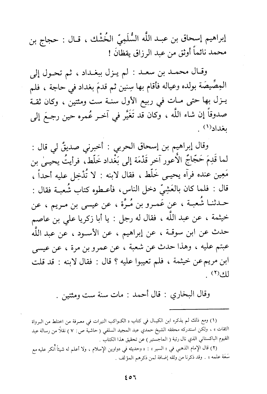 إبراهيم إسحاق بْن عَبد اللَّهِ السلمي الخشك، قال: حجاج بْن مُحَمَّد نائما أوثق من عَبْد الرزاق يقظان!