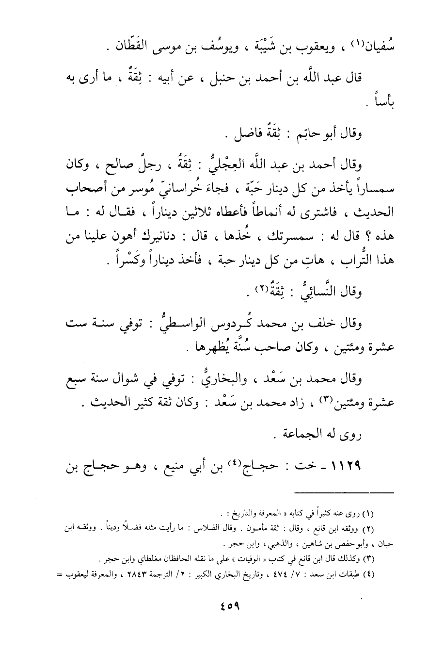 (2) ووثقه ابن قانع، وَقَال: ثقة مأمون. وَقَال الفلاس: ما رأيت مثله فضلا ودينا. ووثقه ابن حبان، وأبو حفص بن شاهين، والذهبي، وابن حجر.