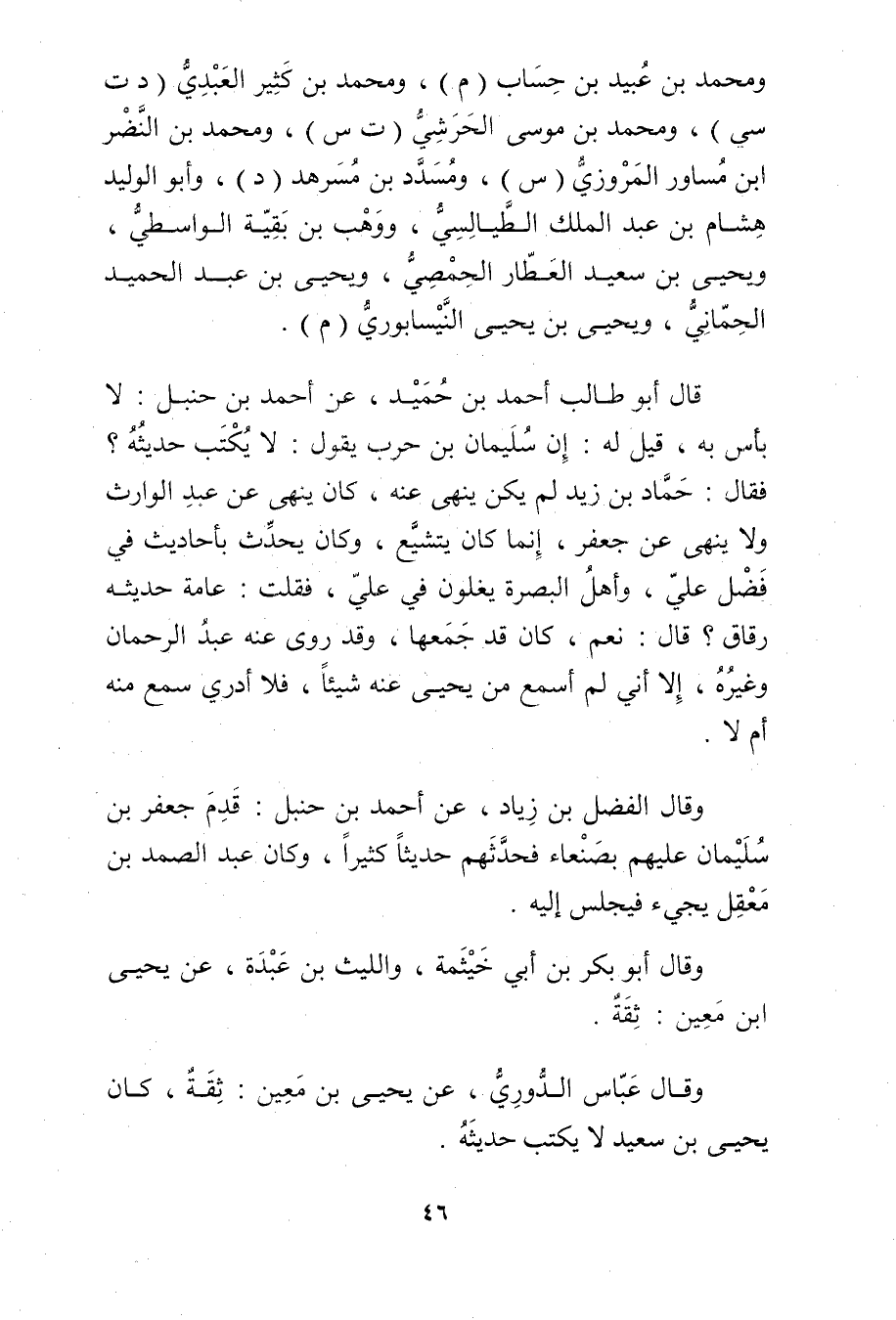 قال أَبُو طالب أَحْمَد بْن حميد، عَن أحمد بْن حنبل: لا بأس بِهِ، قيل له: إن سُلَيْمان بْن حرب يقول: لا يكتب حديثه؟ فَقَالَ: حماد بْن زيد لم يكن ينهى عنه، كَانَ ينهى عَنْ عبد الوارث ولا ينهى عن جعفر، إنما كَانَ يتشيع، وكَانَ يحدث بأحاديث في فضل علي، وأهل البصرة يغلون في علي، فقلت: عامة حديثه رقاق؟ قال: نعم، كان قد جمعها، وقد روى عنه عَبْد الرَّحْمَنِ وغيره، إلا أني لم أسمع من يَحْيَى عنه شيئا، فلا أدري سمع منه أم لا.
