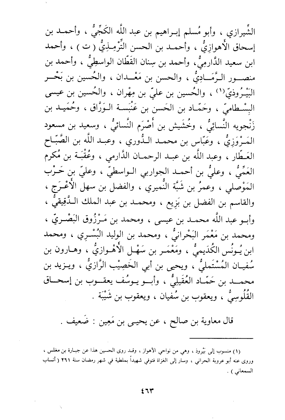 الشيرازي، وأَبُو مسلم إبراهيم بْن عَبد الله الكجي، وأحمد بْن إِسْحَاقَ الأهوازي، وأحمد بْن الحسن التِّرْمِذِيّ (ت) ، وأحمد بْن سَعِيد الدارمي، وأحمد بْن سنان القطان الواسطي، وأحمد بْن منصور الرمادي، والحسن بْن معدان، والحسين بْن بحر البيروذي (1) ، والحسين بْن علي بن مهران، والحسين بْن عيسى البسطامي، وحماد بْن الْحَسَن بْن عنبسة الوراق، وحميد بْن زنجويه النَّسَائي، وخشيش بْن أصرم النَّسَائي، وسَعِيد بْن مسعود