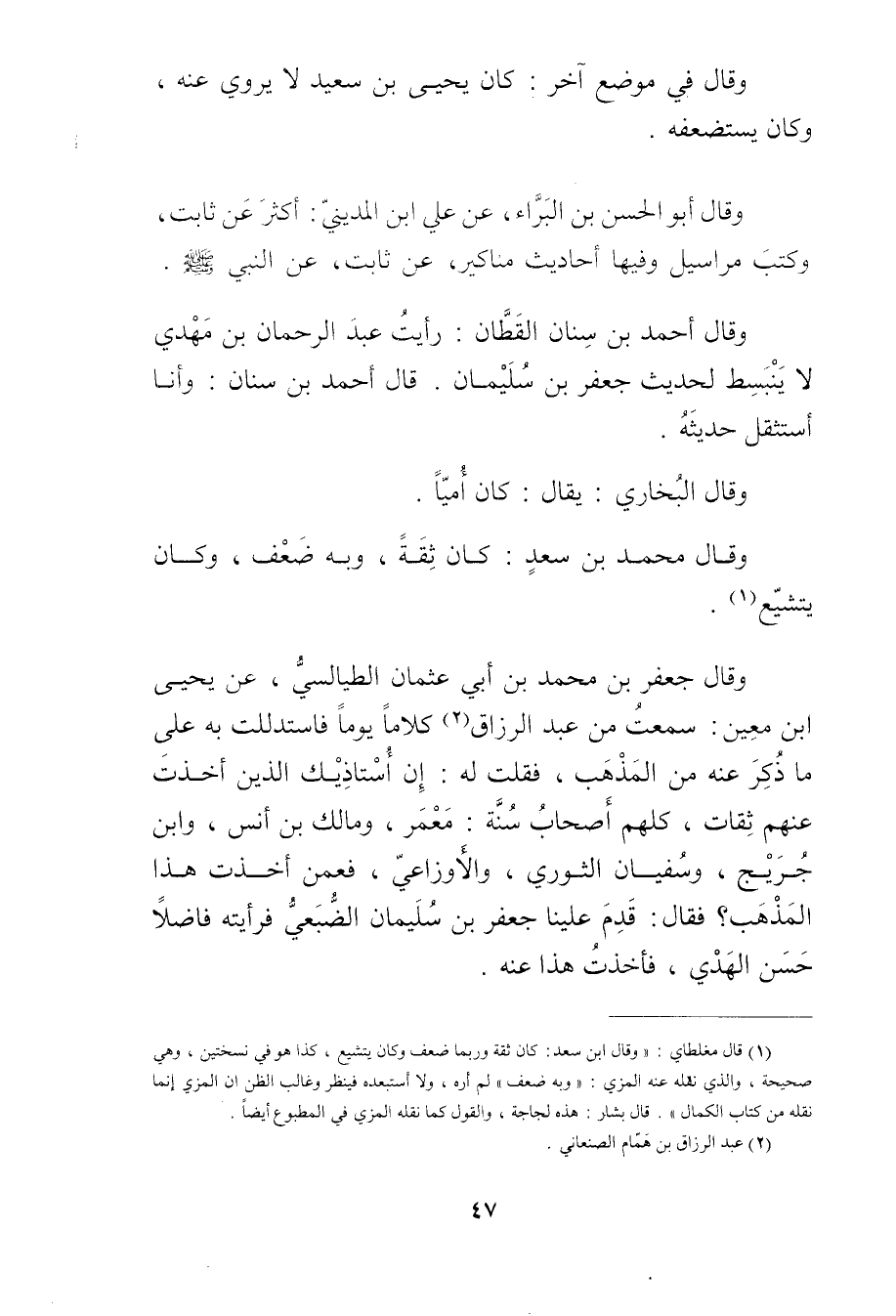 وَقَال جَعْفَر بْن مُحَمَّد بْن أَبي عثمان الطيالسي، عن يَحْيَى ابن مَعِين: سمعت من عَبْد الرزاق (2) كلاما يوما فاستدللت بِهِ على ما ذكر عنه من المذهب، فقلت له: إن أستاذيك الذين أخذت عنهم ثقات، كلهم أصحاب سنة: معمر، ومالك بْن أنس، وابن جُرَيْج، وسفيان الثوري، والأَوزاعِيّ، فعمن أخذت هذا المذهب؟ فَقَالَ: قدم علينا جعفر بْن سُلَيْمان الضبعي فرأيته فاضلا حسن الهدي، فأخذت هذا عنه.