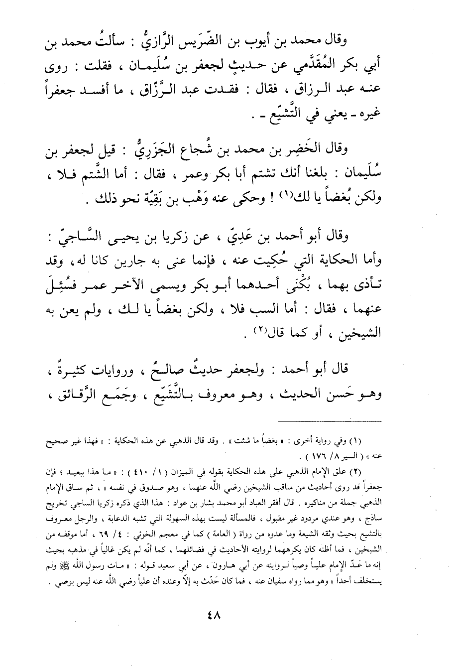 (2) علق الإمام الذهبي على هذه الحكاية بقوله في الميزان (1 / 410) : ما هذا ببعيد، فإن جعفرا قد روى أحاديث من مناقب الشيخين رضي الله عنهما، وهو صدوق في نفسه"، ثم ساق الإمام الذهبي جملة من مناكيره. قال أفقر العباد أبو محمد بشار بن عواد: هذا الذي ذكره زكريا الساجي تخريج ساذج، وهو عندي مردود غير مقبول، فالمسألة ليست لهذه السهولة التي تشبه الدعابة، والرجل معروف بالتشيع بحيث وثقه الشيعة وما عدوه من رواة (العامة) كما في معجم الخوئي: 4 / 69، أما موقفه من الشيخين، فما أظنه كان يكرههما لروايته الاحاديث في فضائلهما، كما أنه لم يكن غاليا في مذهبه بحيث إنه ما عد الإمام عليا وصيا لروايته عَن أبي هارون، عَن أبي سَعِيد قوله: مات رسول الله صلى الله عليه وسلم ولم يستخلف أحدا"وهو مما رواه سفيان عنه، فما كان حدث به إلا وعنده أن عليا رضي الله عنه ليس بوصي.