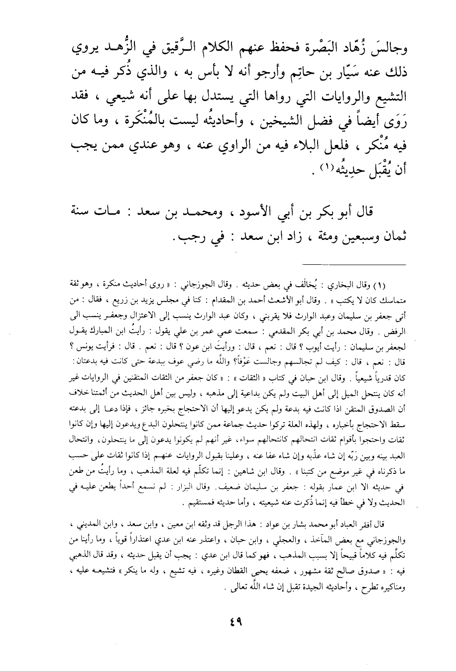 (1) وقَال البُخارِيُّ: يخالف فِي بعض حديثه. وَقَال الجوزجاني: روى أحاديث منكرة، وهو ثقة متماسك كان لا يكتب". وَقَال أَبُو الأشعث أَحْمَد بْن المقدام: كنا في مجلس يزيد بن زريع، فقال: من أتى جعفر بن سُلَيْمان وعبد الوارث فلا يقربني، وكان عبد الوارث ينسب إلى الاعتزال وجعفر ينسب إلى الرفض. وَقَال مُحَمَّد بْن أَبي بَكْر المقدمي: سمعت عمي عُمَر بن علي يقول: رأيت ابن المبارك يقول لجعفر بن سُلَيْمان: رأيت أيوب؟ قال: نعم، قال: ورأيت ابن عون؟ قال: نعم. قال: فرأيت يونس؟ قال: نعم، قال: كيف لم تجالسهم وجالست عوفا؟ والله ما رضي عوف ببدعة حتى كانت فيه بدعتان: كان قدريا شيعيا. وَقَال أبن حبان في كتاب "الثقات": كان جعفر من الثقات المتقنين في الروايات غير أنه كان ينتحل الميل إلى أهل البيت ولم يكن بداعية إلى مذهبه، وليس بين أهل الحديث من أئمتنا خلاف أن الصدوق المتقن إذا كانت فيه بعدة ولم يكن يدعو إليها أن الاحتجاج بخبره جائز، فإذا دعا إلى بدعته سقط الاحتجاج بأخباره، ولهذه العلة تركوا حديث جماعة ممن كانوا ينتحلون البدع ويدعون إليها وإن كانوا ثقات واحتجوا بأقوام ثقات انتحالهم كانتحالهم سواء، غير أنهم لم يكونوا يدعون إلى ما ينتحلون، وانتحال العبد بينه وبين ربه إن شاء عذبه وإن شاء عفا عنه، وعلينا بقبول الروايات عنهم إذا كانوا ثقات على حسب ما ذكرناه في غير موضع من كتبنا". وَقَال ابن شاهين: إنما تكلم فيه لعلة المذهب، وما رأيت من طعن في حديثه الا ابن عمار بقوله: جعفر بن سُلَيْمان ضعيف. وَقَال البزار: لم نسمع أحدًا يطعن عليه في الحديث ولا في خطأ فيه إنما ذكرت عنه شيعيته، وأما حديثه فمستقيم.