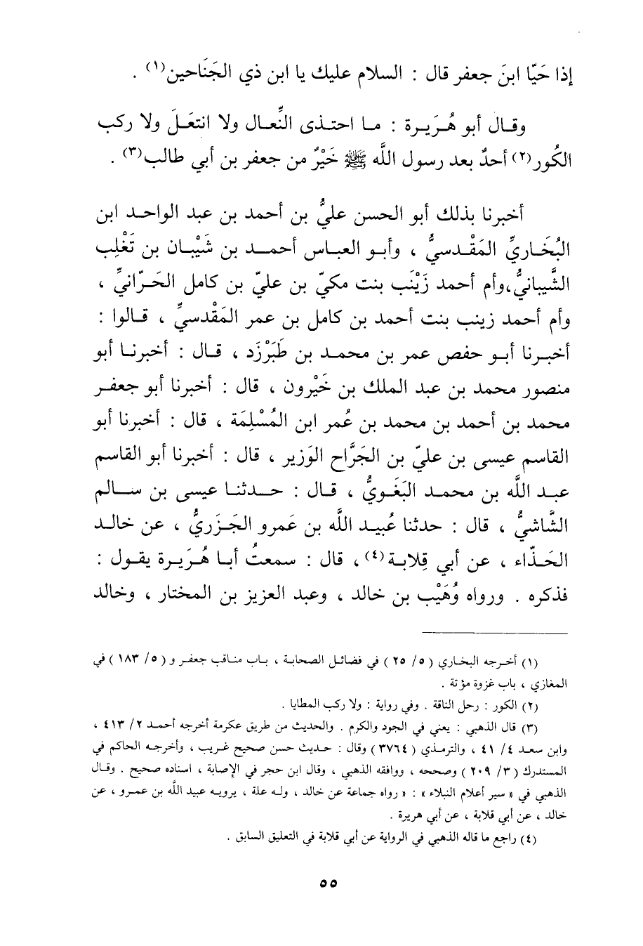 (1) أخرجه البخاري (5 / 25) في فضائل الصحابة. باب مناقب جعفر و (5 / 183) في المغازي، باب غزوة مؤتة.