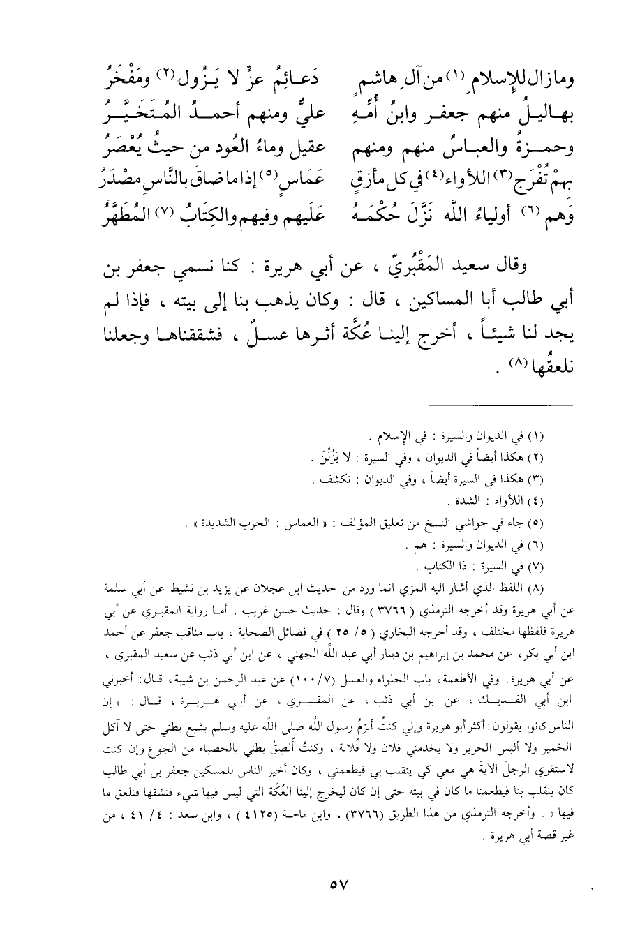 وهم (6) أَوْلِيَاءُ اللَّه نَزَّلَ حُكْمَه • عَلَيْهِمْ وفِيهِمْ والْكِتَابُ (7) الْمُطَهَّرُ وَقَال سَعِيد المقبري، عَن أَبِي هُرَيْرة: كنا نسمي جعفر بْن أَبي طالب أبا المساكين، قال: وكَانَ يذهب بنا إلى بيته، فإذا لم يجد لنا شيئا، أخرج إلينا عكة أثرها عسل، فشققناها وجعلنا نلعقها (8) .