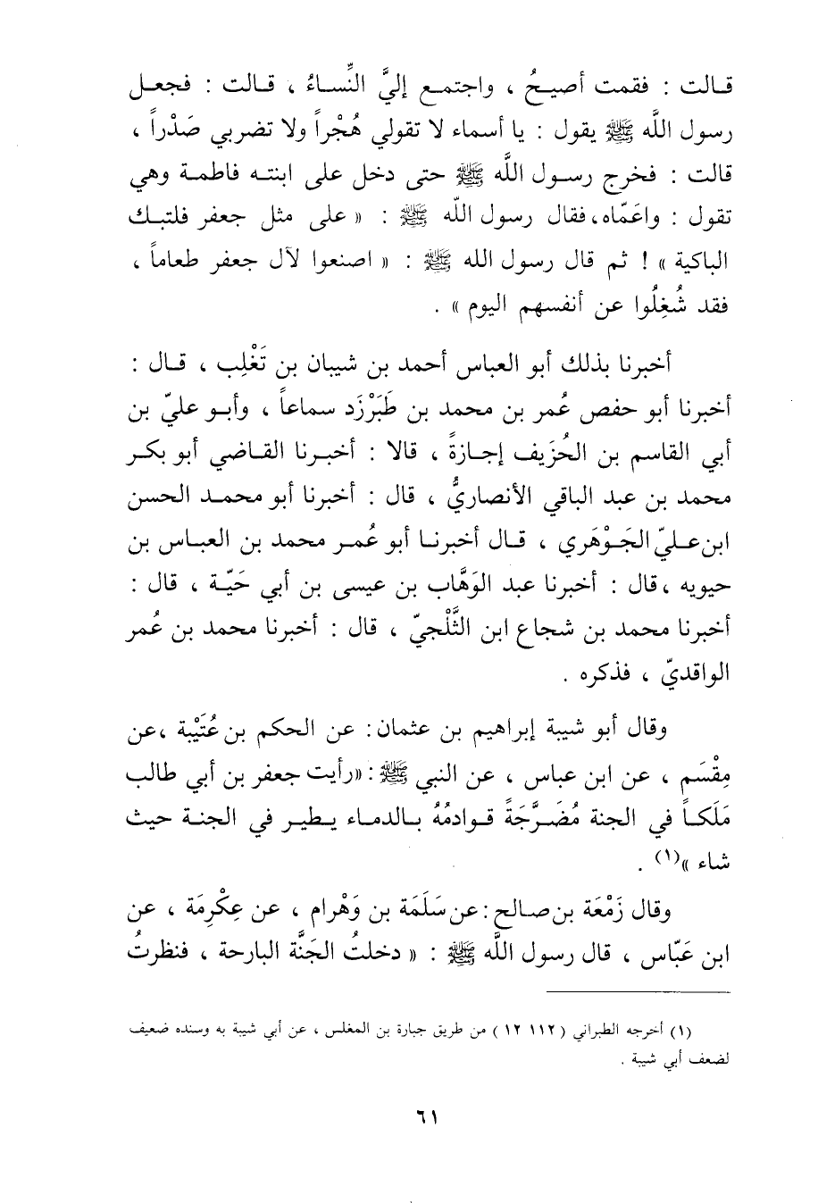 وَقَال أَبُو شَيْبَة إِبْرَاهِيمُ بْنُ عُثْمَانَ: عَنِ الْحَكَمِ بْنِ عُتَيْبَةَ، عَنْ مِقْسَمٍ، عَنِ ابْنِ عَبَّاسٍ، عَنِ النَّبِيِّ صلى الله عليه وسلم: رأيت جَعْفَرَ بْنَ أَبي طَالِبٍ مَلَكًا فِي الْجَنَّةِ مُضَرَّجَةً قَوَادِمُهُ بِالدِّمَاءِ يَطِيرُ فِي الْجَنَّةِ حَيْثُ شَاءَ" (1) .