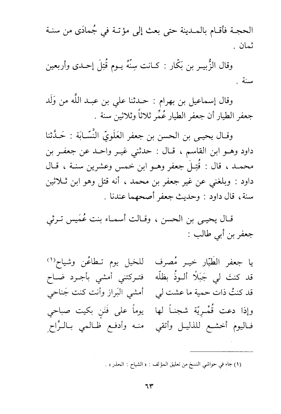 قال يَحْيَى بْن الحسن، وَقَالت أسماء بنت عميس ترثي جعفر بْن أَبي طالب: