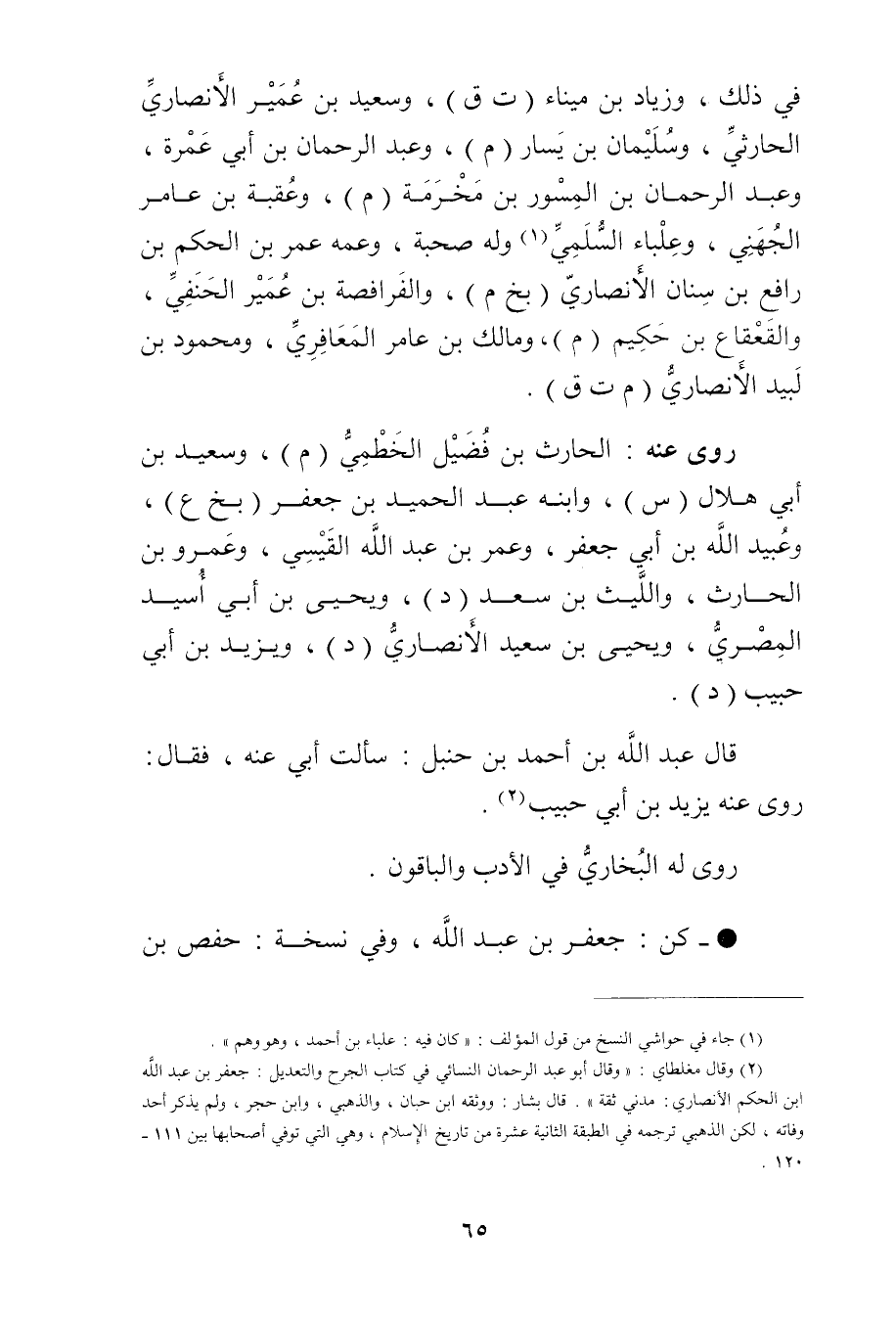 (2) وَقَال مغلطاي: وَقَال أَبُو عَبْد الرَّحْمَنِ النَّسَائي فِي كتاب الجرح والتعديل: جعفر بْن عَبد اللَّهِ بْن الحكم الأَنْصارِيّ: مدني ثقة". قال بشار: ووثقه ابن حبان، والذهبي، وابن حجر، ولم يذكر أحد وفاته، لكن الذهبي ترجمه في الطبقة الثانية عشرة من تاريخ الاسلام، وهي التي توفي أصحابها بين 111 120.