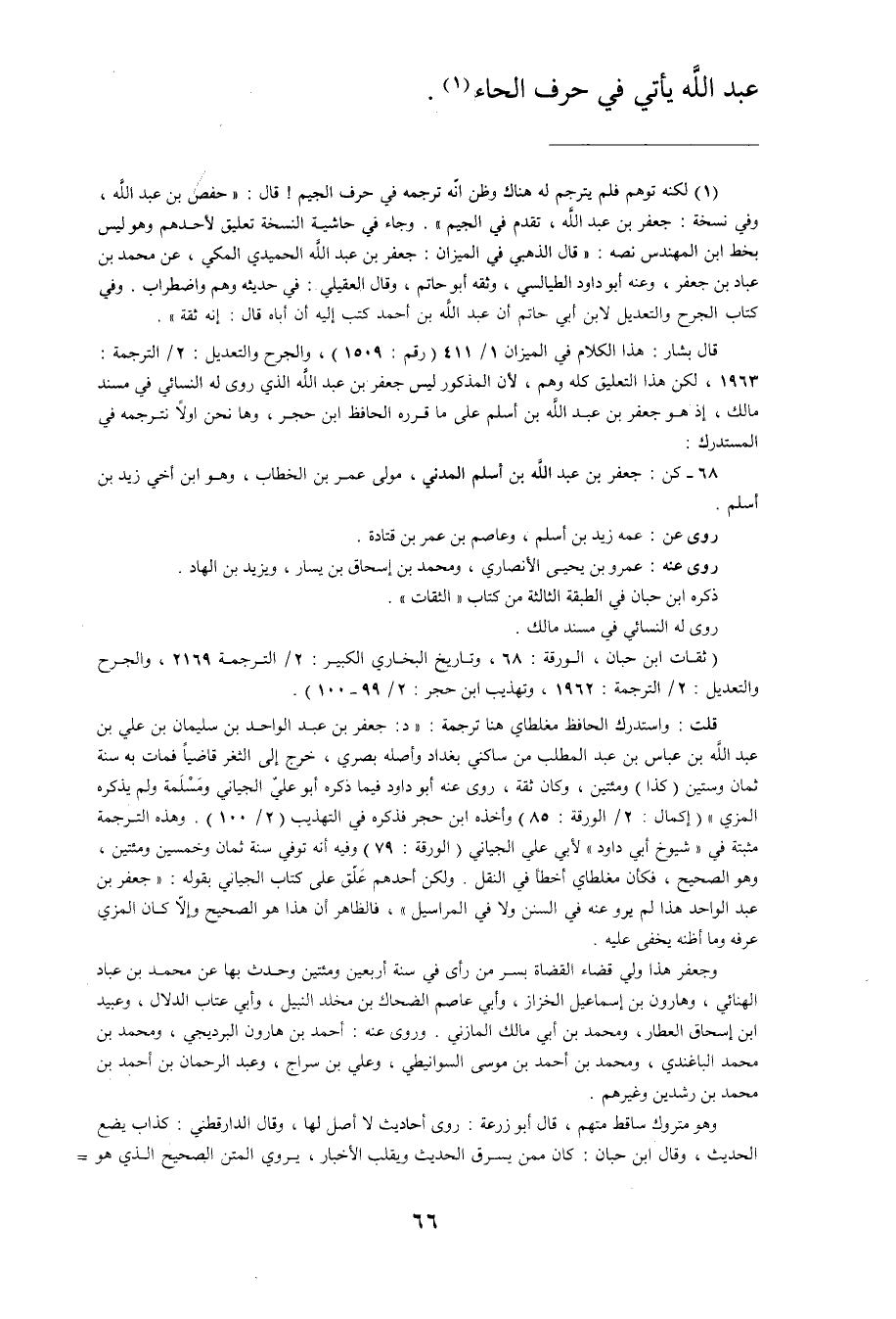 وجاء في حاشية النسخة تعليق لاحدهم وهو ليس بخط ابن المهندس نصه: قال الذهبي في الميزان: جعفر بن عَبد الله الحميدي المكي، عن محمد بن عباد بن جعفر، وعنه أبو داود الطيالسي، وثقه أبو حاتم، وَقَال العقيلي: في حديثه وهم واضطراب. وفي كتاب الجرح والتعديل لابن أَبي حاتم أن عَبد الله بن أحمد كتب إليه أن أباه ققال: إنه ثقة". قال بشار: هذا الكلام في الميزان 1 / 411 (رقم: 1509) ، والجرح والتعديل: 2 / الترجمة: 1963، لكن هذا التعليق كله وهم، لان المذكور ليس جعفر بن عَبد الله الذي روى له النَّسَائي في مسند مالك، إذ هو جعفر بن عَبد الله بن أسلم على ما قرره الحافظ ابن حجر، وها نحن اولا نترجمه في المستدرك: