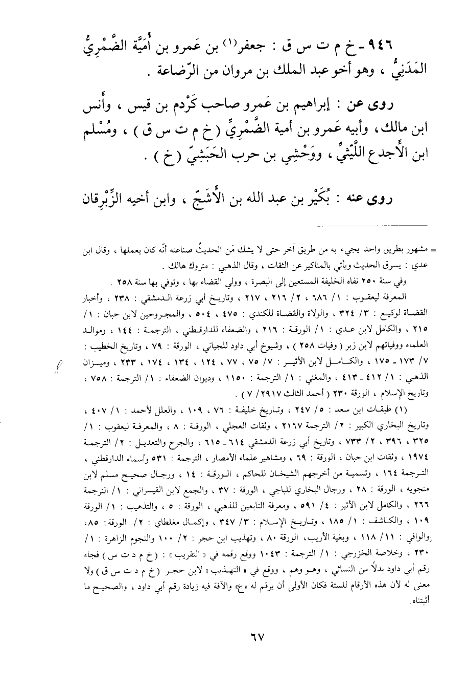 946 خ م ت س ق: جعفر بْن عَمْرو بْن أمية الضمري المدني (1) ، وهو أخو عَبد المَلِك بن مروان بن الرضاعة.