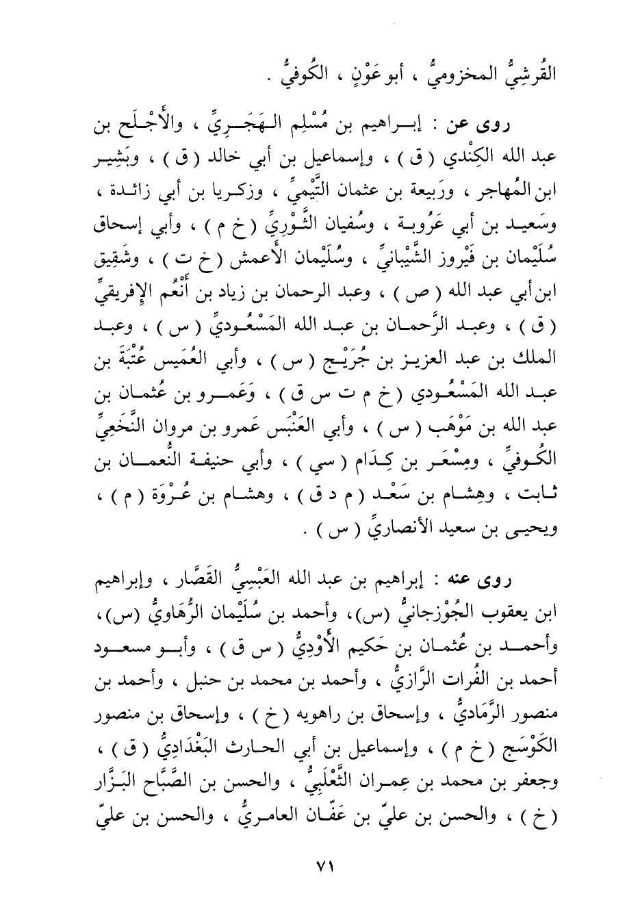 رَوَى عَن: إِبْرَاهِيم بْن مسلم الهجري، والأجلح بْن عَبد اللَّهِ الكندي (ق) ، وإسماعيل بْن أَبي خالد (ق) ، وبشير ابن المهاجر، وربيعة بْن عثمان التَّيْمِيّ، وزكريا بْن أَبي زائدة، وسَعِيد بْن أَبي عَرُوبَة، وسفيان الثوري (خ م) ، وأبي إسحاق سُلَيْمان بْن فيروز الشيباني، وسُلَيْمان الأعمش (خ ت) ، وشقيق ابن أَبي عَبد اللَّهِ (ص) ، وعبد الرحمن بْن زياد بْن أنعم الإفْرِيقيّ (ق) ، وعبد الرحمن بْن عَبد اللَّهِ المسعودي (س) ، وعبد الملك بْن عَبْد الْعَزِيزِ بْن جُرَيْج (س) ، وأبي العميس عتبة بْن عَبد اللَّهِ المسعودي (خ م ت س ق) ، وعَمْرو بْنِ عُثْمَانَ بْنِ عَبد اللَّهِ بْنِ موهب (س) ، وأبي العنبس عَمْرو بْن مروان النخعي الكوفي، ومسعر بْن كدام (سي) ، وأبي حنيفة النعمان بْن ثابت، وهشام بْن سعد (م د ق) ، وهشام بْن عروة (م) ، ويحيى بْن سَعِيد الأَنْصارِيّ (س) .