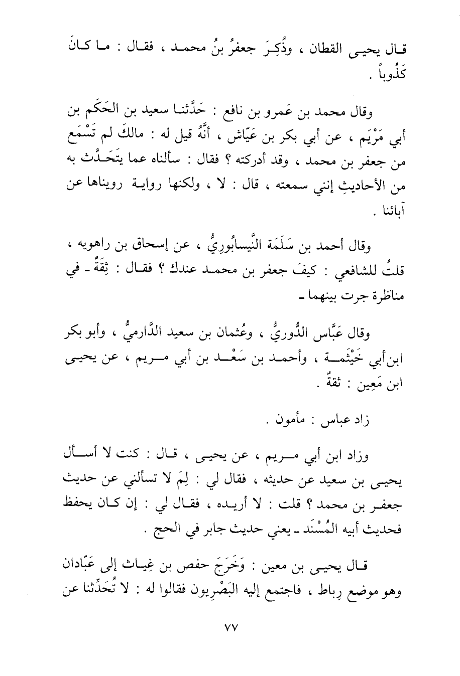 وزاد ابْن أَبي مريم، عن يَحْيَى، قال: كنت لا أسأل يَحْيَى بْن سَعِيد عن حديثه، فَقَالَ لي: لم لا تسألني عن حديث جعفر بْن مُحَمَّد؟ قلت: لا أريده، فَقَالَ لي: إن كَانَ يحفظ فحديث أبيه المسند يعني حديث جابر في الحج.