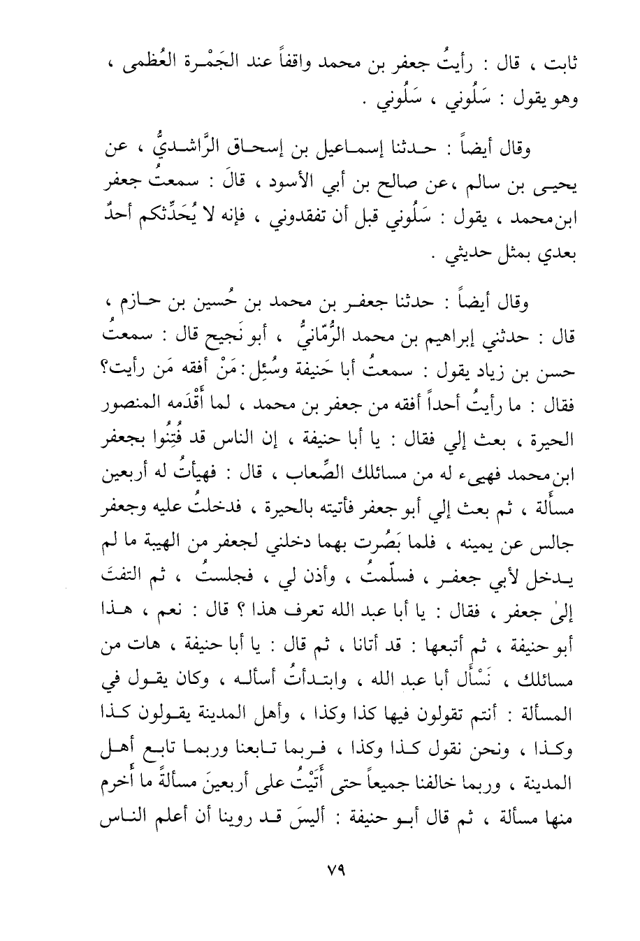 وَقَال أيضا: حَدَّثَنَا جعفر بْن مُحَمَّد بْن حسين بْن حازم، قال: حَدَّثَنِي إبراهيم بْن مُحَمَّد الرماني، أَبُو نجيح قال: سمعت حسن بْن زياد يقول: سمعت أبا حنيفة وسئل: من أفقه من رأيت؟ فَقَالَ: ما رأيت أحدا أفقه من جعفر بْن مُحَمَّد، لما أقدمه المنصور الحيرة، بعث إلي فَقَالَ: يا أبا حنيفة، إن الناس قد فتنوا بجعفر ابن مُحَمَّد فهيئ له من مسائلك الصعاب، قال: فهيأت له أربعين مسألة، ثم بعث إلي أَبُو جعفر فأتيته بالحيرة، فدخلت عليه وجعفر جالس عن يمينه، فلما بصرت بهما دخلني لجعفر من الهيبة ما لم يدخل لأبي جعفر، فسلمت، وأذن لي، فجلست، ثم التفت إلى جعفر، فَقَالَ: يا أبا عَبد اللَّهِ تعرف هذا؟ قال: نعم، هذا أَبُو حنيفة، ثم أتبعها: قد أتانا، ثم قال: يا أبا حنيفة؟ هات من مسائلك، نسأل أبا عَبد الله، ابتدأت أسأله، وكَانَ يقول في المسألة: أنتم تقولون فيها كذا وكذا، وأهل المدينة يقولون كذا وكذا، ونحن نقول كذا وكذا، فربما تابعنا وربما تابع أهل المدينة، وربما خالفنا جميعا حتى أتيت على أربعين مسألة ما أخرم منها مسألة، ثم قال أَبُو حنيفة: أليس قد روينا أن أعلم الناس