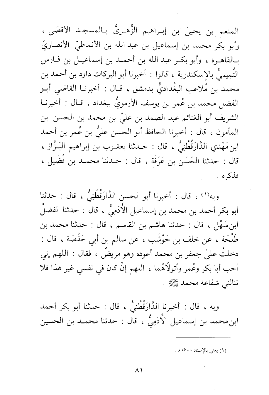 المنعم بْن يَحْيَى بْن إبراهيم الزُّهْرِيّ بالمسجد الأقصى، وأَبُو بَكْرٍ مُحَمَّد بْن إِسْمَاعِيل بْن عَبد اللَّهِ بْنِ الأنماطي الأَنْصارِيّ بالقاهرة، وأَبُو بَكْر عَبد اللَّهِ بْن أَحْمَدَ بْنِ إِسْمَاعِيلَ بْن فارس التميمي بالإسكندرية، قَالُوا: أَخْبَرَنَا أَبُو الْبَرَكَاتِ دَاوُدُ بْنُ أَحْمَدَ بْنِ مُحَمَّدِ بْنِ ملاعب البغدادي بدمشق، قال: أَخْبَرَنَا الْقَاضِي أَبُو الْفَضْلِ مُحَمَّدُ بْنُ عُمَر بْنِ يُوسُفَ الأرموي ببغداد، قال: أَخْبَرَنَا الشريف أَبُو الْغَنَائِمِ عَبْدُ الصَّمَدِ بْنُ عَلِيِّ بْن مُحَمَّدِ بْن الْحَسَن بْن المأمون، قال: أَخْبَرَنَا الْحَافِظُ أَبُو الْحَسَنِ عَلِيُّ بْنُ عُمَر بْن أَحْمَدَ بْن مهدي الدارقطني، قال: حَدَّثَنَا يعقوب بْن إبراهيم البزاز، قال: حَدَّثَنَا الْحَسَنُ بْنُ عرفة، قال: حَدَّثَنَا مُحَمَّدُ بْنُ فضيل، فذكره.