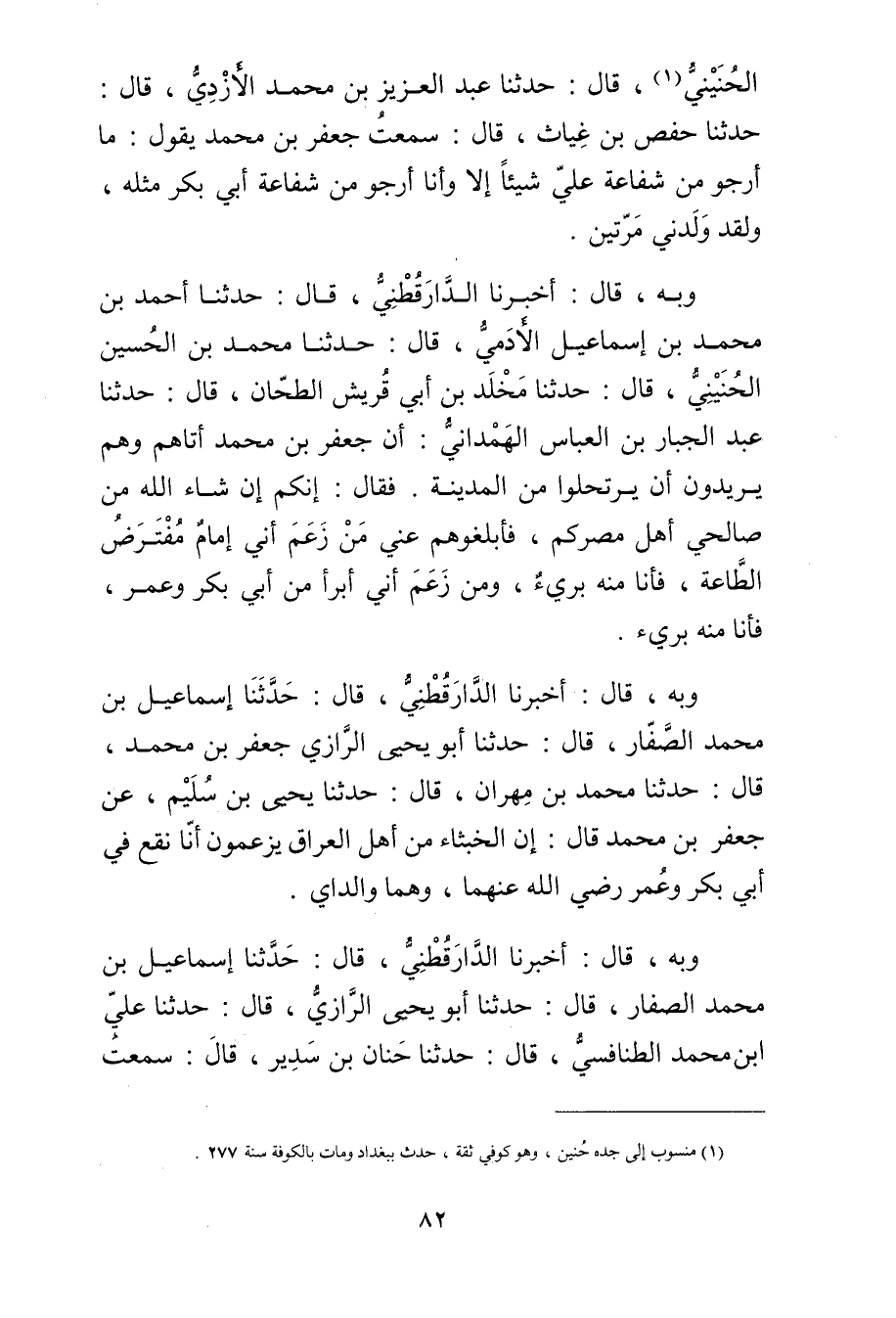 الحنيني (1) ، قال: حَدَّثَنَا عَبْدُ الْعَزِيزِ بْن مُحَمَّد الأزدي، قال: حَدَّثَنَا حفص بْن غياث، قال: سمعت جعفر بْن مُحَمَّد يقول: ما أرجو من شفاعة علي شيئا إلا وأنا أرجو من شفاعة أبي بكر مثله، ولقد ولدني مرتين.