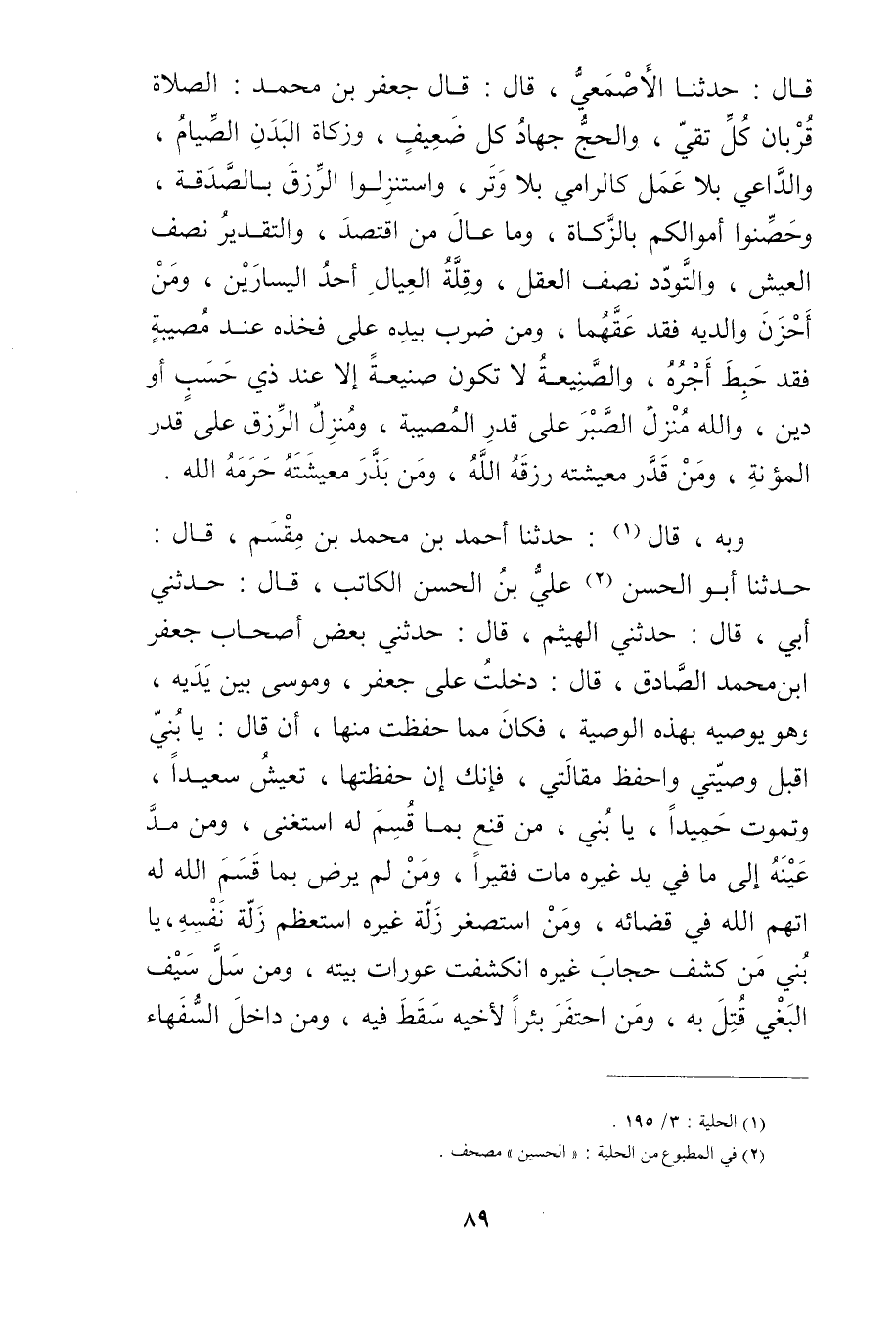 قال: حَدَّثَنَا الأَصْمَعِيّ، قال: قال جعفر بْن مُحَمَّد: الصلاة قربان كل تقي، والحج جهاد كل ضعيف، وزكاة البدن الصيام، والداعي بلا عمل كالرامي بلا وتر، واستنزلوا الرزق بالصدقة، وحصنوا أموالكم بالزكاة، وما عال من اقتصد، والتقدير نصف العيش، والتودد نصف العقل، وقلة العيال أحد اليسارين، ومن أحزن والديه فقد عقهما، ومن ضرب بيده على فخذه عند مصيبة فقد حبط أجره، والصنيعة لا تكون صنيعة إلا عند ذي حسب أو دين، والله منزل الصبر على قدر المصيبة، ومنزل الرزق على قدر المؤنة، ومن قدر معيشته رزقه اللَّه، ومن بذر معيشته حرمه اللَّه.