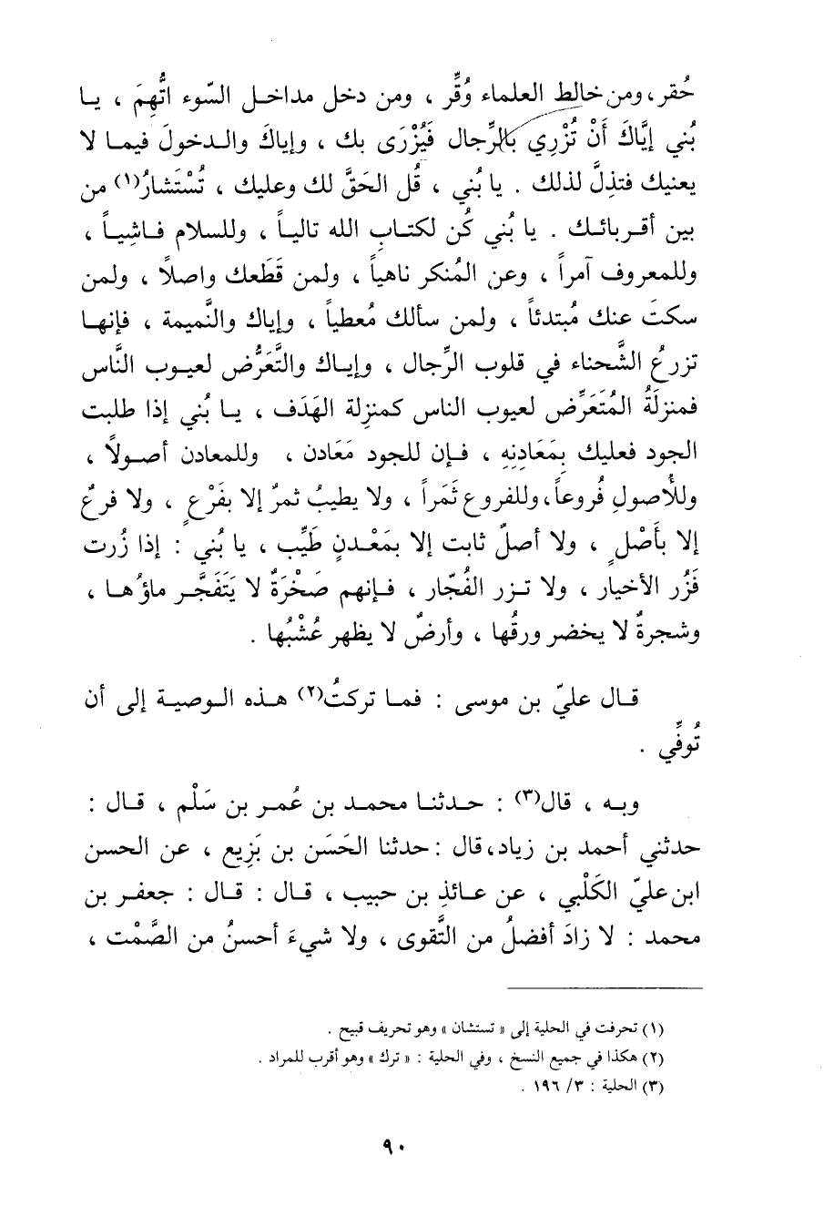 يا بني كن لكتاب اللَّه تاليا، وللسلام فاشيا، وللمعروف آمرا، وعن المنكر ناهيا، ولمن قطعك واصلا، ولمن سكت عنك مبتدئا، ولمن سألك معطيا، وإياك والنميمة، فإنها تزرع الشحناء في قلوب الرجال، وإياك والتعرض لعيوب الناس فمنزلة المتعرض لعيوب الناس كمنزلة الهدف، يا بني إذا طلبت الجود فعليك بمعادنه، فإن للجود معادن، وللمعادن أصولا، وللأصول فروعا، وللفروع ثمرا، ولا يطيب ثم إلا بفرع، ولا فرع إلا بأصل، ولا أصل ثابت إلا بمعدن طيب، يا بني: إذا زرت فزر الأخيار، ولا تزر الفجار، فإنهم صخرة لا يتفجر ماؤها، وشجرة لا يخضر ورقها، وأرض لا يظهر عشبها.