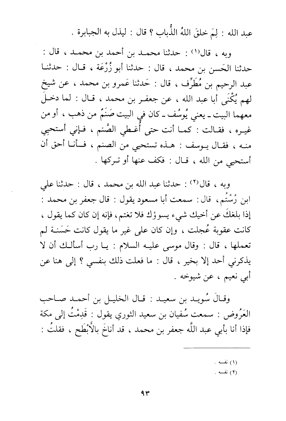 وَقَال سويد بْن سَعِيد: قال الخليل بْن أَحْمَدَ صاحب العروض: سمعت سفيان بْن سَعِيد الثوري يقول: قدمت إلى مكة فإذا أنا بأبي عَبد اللَّهِ جعفر بْن مُحَمَّد، قد أناخ بالابطح، فقلت: