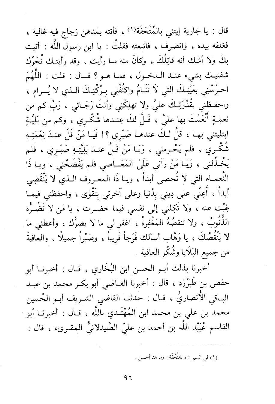 قال: يا جارية إيتني بالمتحفة (1) ، فأتته بمدهن زجاج فيه غالية، فغلفه بيده، وانصرف، فاتبعته فقلت: يا ابن رَسُول اللَّهِ: أتيت بك ولا أشك أنه قاتلك، وكَانَ منه ما رأيت، وقد رأيتك تحرك شفتيك بشيءٍ عند الدخول، فما هو؟ قال: قلت: اللهم احرسني بعينك التي لا تنام واكنفني بركنك الذي لا يرام، واحفظني بقدرتك علي ولا تهلكني وأنت رجائي، رب كم من نعمة أنعمت بها علي، قل لك عندهها شكري، وكم من بلية ابتليتني بها، قل لك عندها صبري؟ ! فيا من قل عند نعمته شكري، فلم يحرمني، ويا من قل عند بليته صبري، فلم يخذلني، ويا من رآني علي المعاصي فلم يفضحني، ويا ذا النعماء التي لا تحصى أبدا، ويا ذا المعروف الذي لا ينقضي أبدا، أعني على ديني بدنيا وعلى آخرتي بتقوى، واحفظني فيما غبت عنه، ولا تكلني إلى نفسي فيما حضرت، يا من لا تضره الذنوب، ولا تنقصه المغفرة، اغفر لي ما لا يضرك، وأعطني ما لا ينقصك، يا وهاب أسألك فرجا قريبا، وصبرا جميلا، والعافية من جميع البلايا وشكر العافية.
