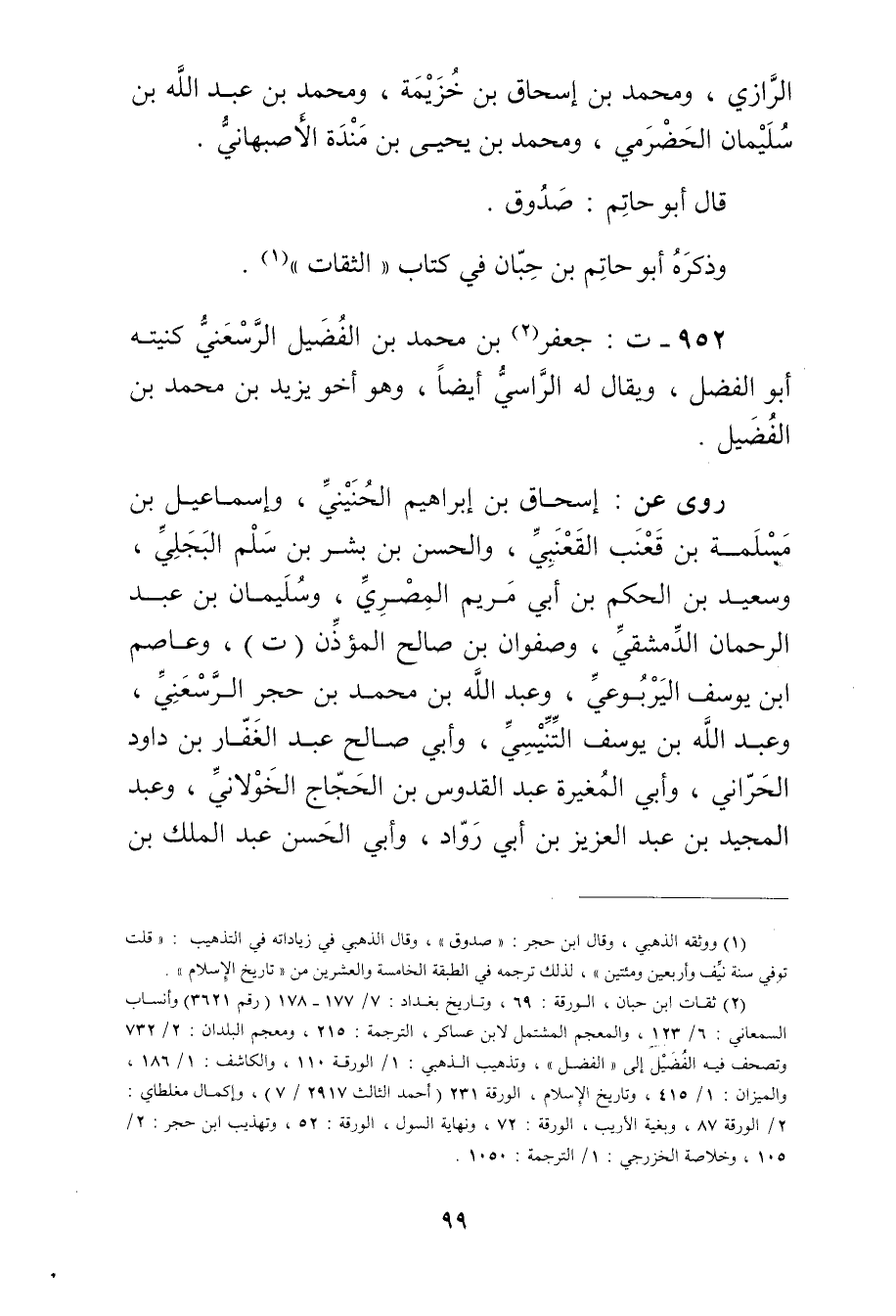 952 ت: جعفر بن مُحَمَّدِ بن الفضيل الرسعني كنيته أَبُو الفضل (2) ، ويُقال له الراسي أيضا، وهو أخو يزيد بْن مُحَمَّدِ بْنِ الفضيل.