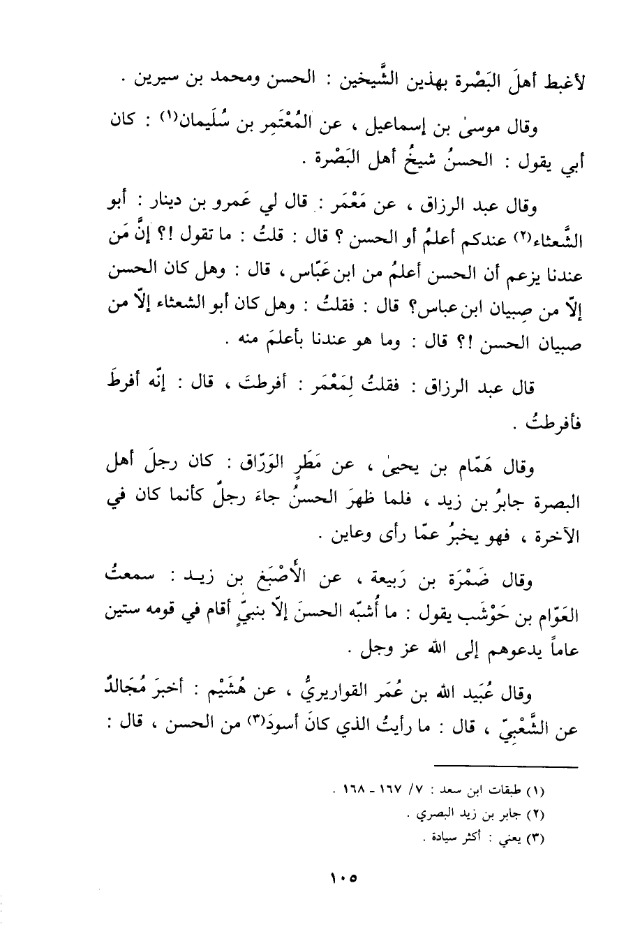 وَقَال عَبْد الرزاق، عن معمر: قال لي عَمْرو بْن دينار: أَبُو الشعثاء (2) عندكم أعلم أو الْحَسَن؟ قال: قلت: ما تقول! ؟ إن من عندنا يزعم أن الْحَسَن أعلم من ابْن عَبَّاس، قال: وهل كَانَ الْحَسَن إلا من صبيان ابْن عَبَّاس؟ قال: فقلت: وهل كَانَ أَبُو الشعثاء إلا من صبيان الْحَسَن! ؟ قال: وما هو عندنا بأعلم منه.