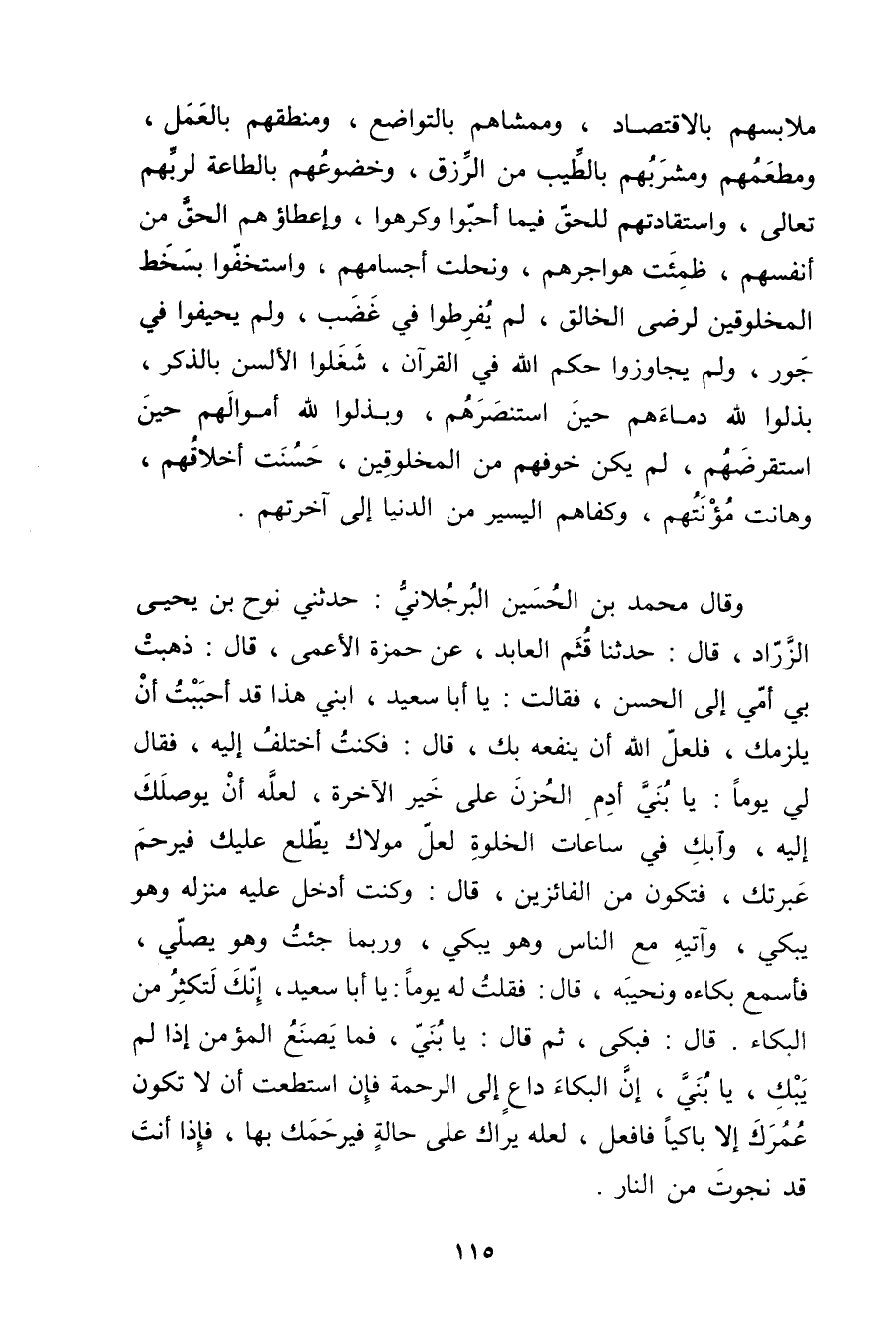 قال: فبكى، ثم قال: يا بني، فما يصنع المؤمن إذا لم يبك، يا بني، إن البكاء داع إلى الرحمة فإن استطعت أن لا تكون عُمَرك إلا باكيا فافعل، لعله يراك على حالة فيرحمك بها، فإذا أنتقد نجوت من النار.