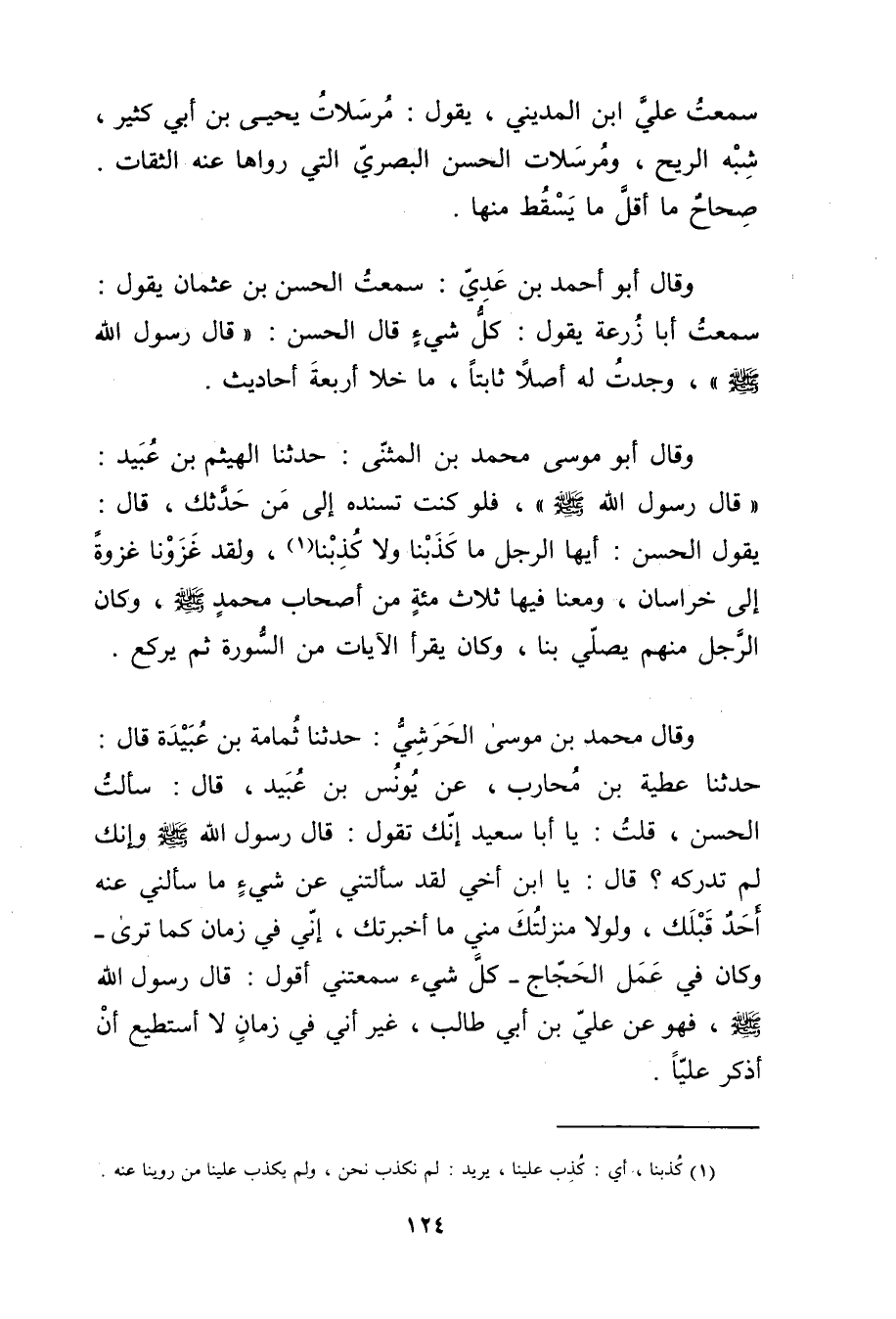 وَقَال مُحَمَّد بْن موسى الحرشي: حَدَّثَنَا ثمامة بْن عُبَيدة قال: حَدَّثَنَا عطية بْن محارب، عن يونس بْن عُبَيد، قال: سألت الْحَسَن، قلت: يا أبا سَعِيد إنك تقول: قال رَسُول اللَّهِ صلى الله عليه وسلم وإنك لم تدركه؟ قال: يا ابْن أخي لقد سألتني عن شيء ما سألني عنه أحد قبلك، ولولا منزلتك مني ما أخبرتك، إني في زمان كما ترى - وكان في عمل الحجاج - كل شيء سمعتني أقول: قال رَسُول اللَّهِ صَلَّى اللَّهُ عليه وسلم، فهو عن علي بْن أَبي طالب، غير أني في زمان لا أستطيع أن أذكر علياً.
