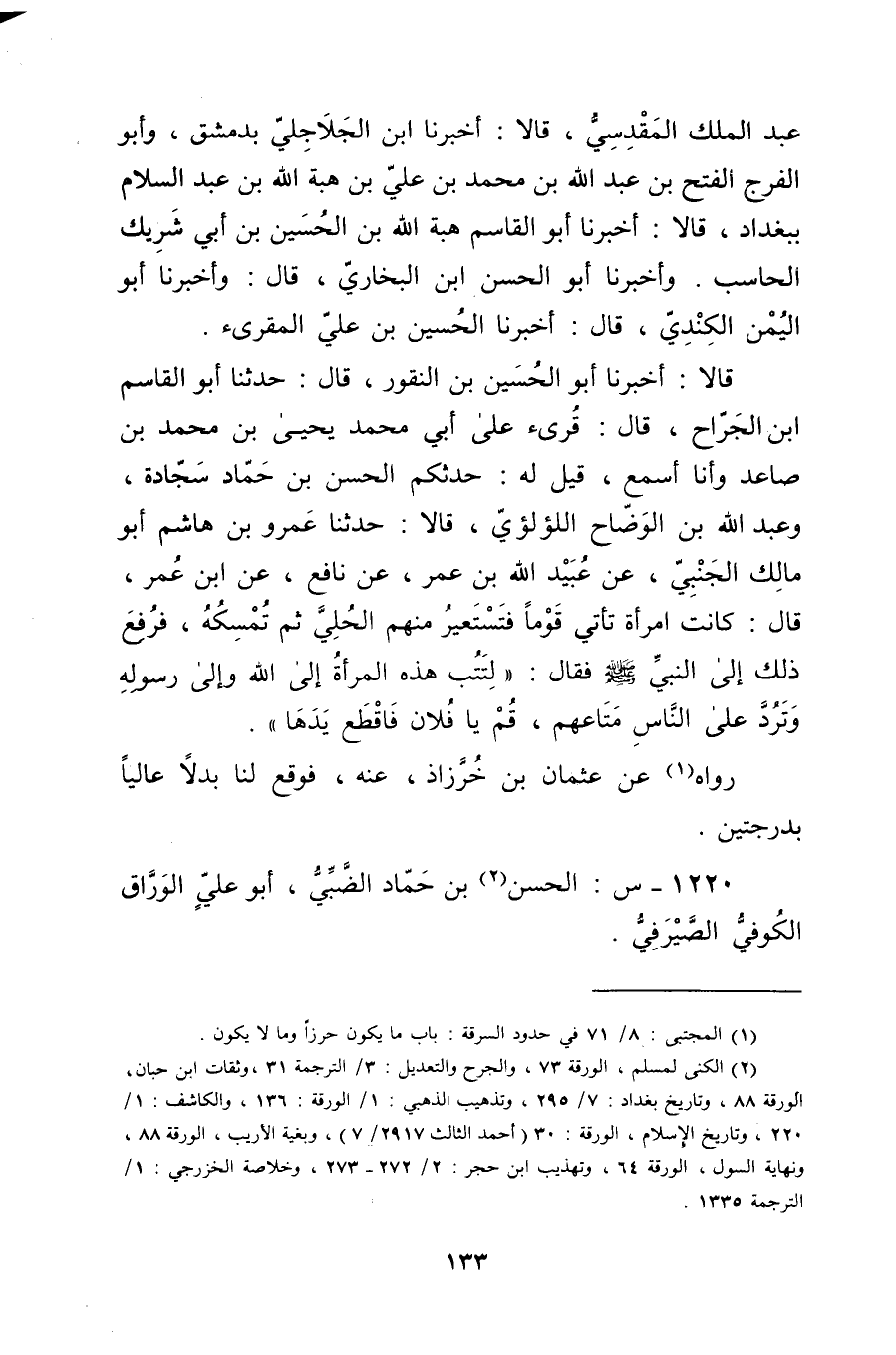 قَالا: أخبرنا أَبُو الْحُسَيْنِ بْنُ النَّقُورِ، قال: حَدَّثَنَا أَبُو القاسم ابن الْجَرَّاحِ، قال: قُرِئَ عَلَى أَبِي مُحَمَّد يحيى بْن مُحَمَّد بْن صَاعِدٍ وأَنَا أَسْمَعُ، قِيلَ لَهُ حَدَّثَكُمُ الْحَسَنُ بْنُ حَمَّادٍ سَجَّادَةٌ، وعبد الله بن الوضاح اللؤلؤي، قَالا: حَدَّثَنَا عَمْرو بْنُ هَاشِمٍ أبو مَالِكٍ الْجَنْبِيُّ، عن عُبَيد اللَّهِ بْنِ عُمَر، عن نَافِعٍ، عن ابْن عُمَر، قال: كَانَتِ امْرَأَةٌ تَأْتِي قَوْمًا فَتَسْتَعِيرُ مِنْهُمُ الْحُلِيُّ ثُمَّ تُمْسِكُهُ، فَرُفِعَ ذَلِكَ إِلَى النبي صلى الله الله عليه وسلم فَقَالَ: لِتَتُبْ هَذِهِ الْمَرْأَةُ إِلَى اللَّهِ وإِلَى رسوله وترد على اناس مَتَاعَهُمْ، قُمْ يَا فُلانٌ فَاقْطَعْ يَدَهَا.