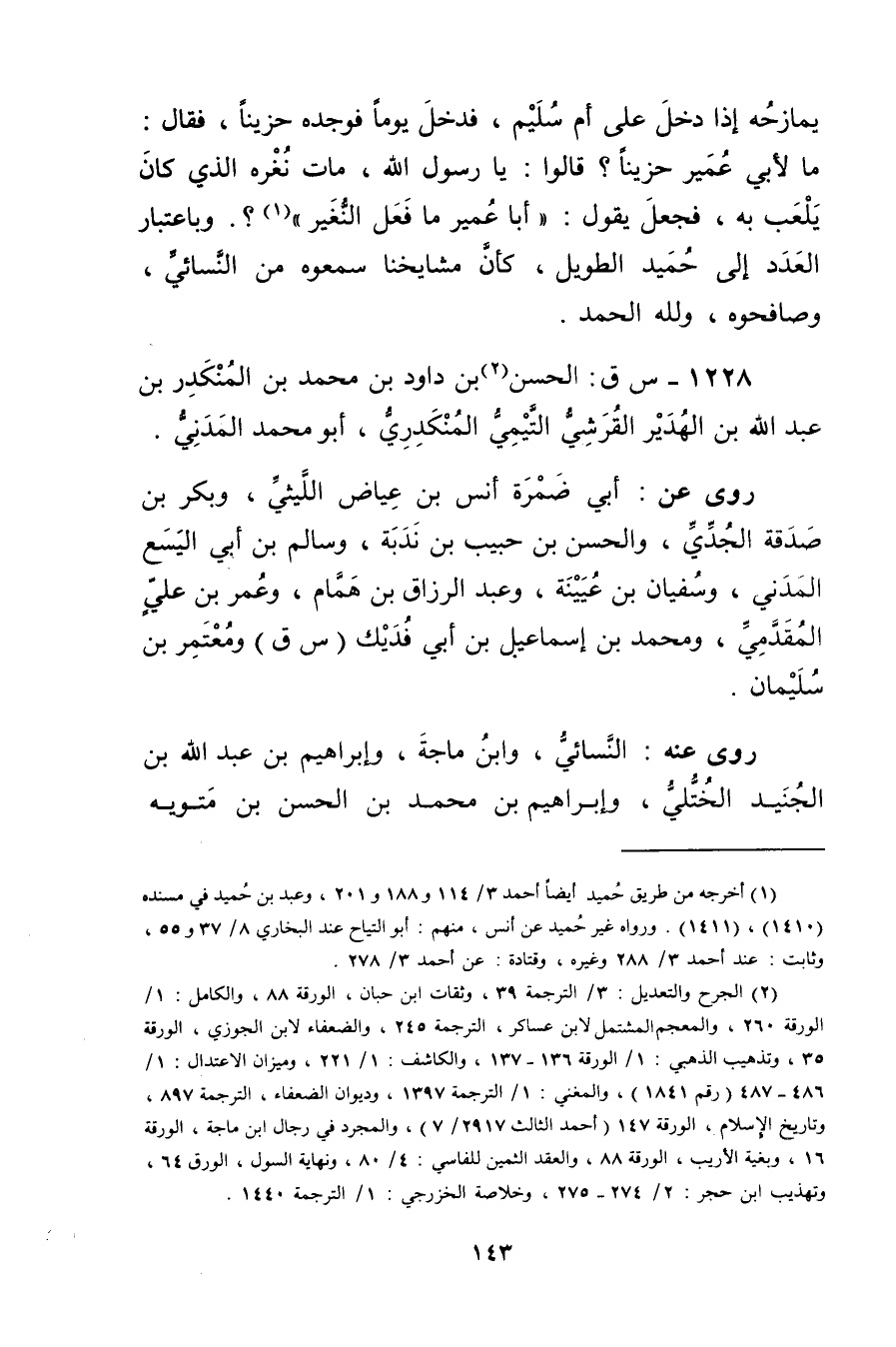 يُمَازِحُهُ إِذَا دَخَلَ عَلَى أُمِّ سُلَيْمٍ، فَدَخَلَ يَوْمًا فَوَجَدَهُ حَزِينًا، فَقَالَ: مَا لأَبِي عُمَير حَزِينًا؟ قَالُوا: يَا رَسُولَ اللَّهِ، مَاتَ نُغْرُهُ الَّذِي كَانَ يَلْعَبُ بِهِ، فَجَعَلَ يَقُوُل: أَبَا عُمَير مَا فَعَلَ النُّغَيْرُ" (1) ؟. وباعتبار العدد إلى حميد الطويل، كأن مشايخنا سمعوه من النَّسَائي، وصافحوه، ولله الحمد.