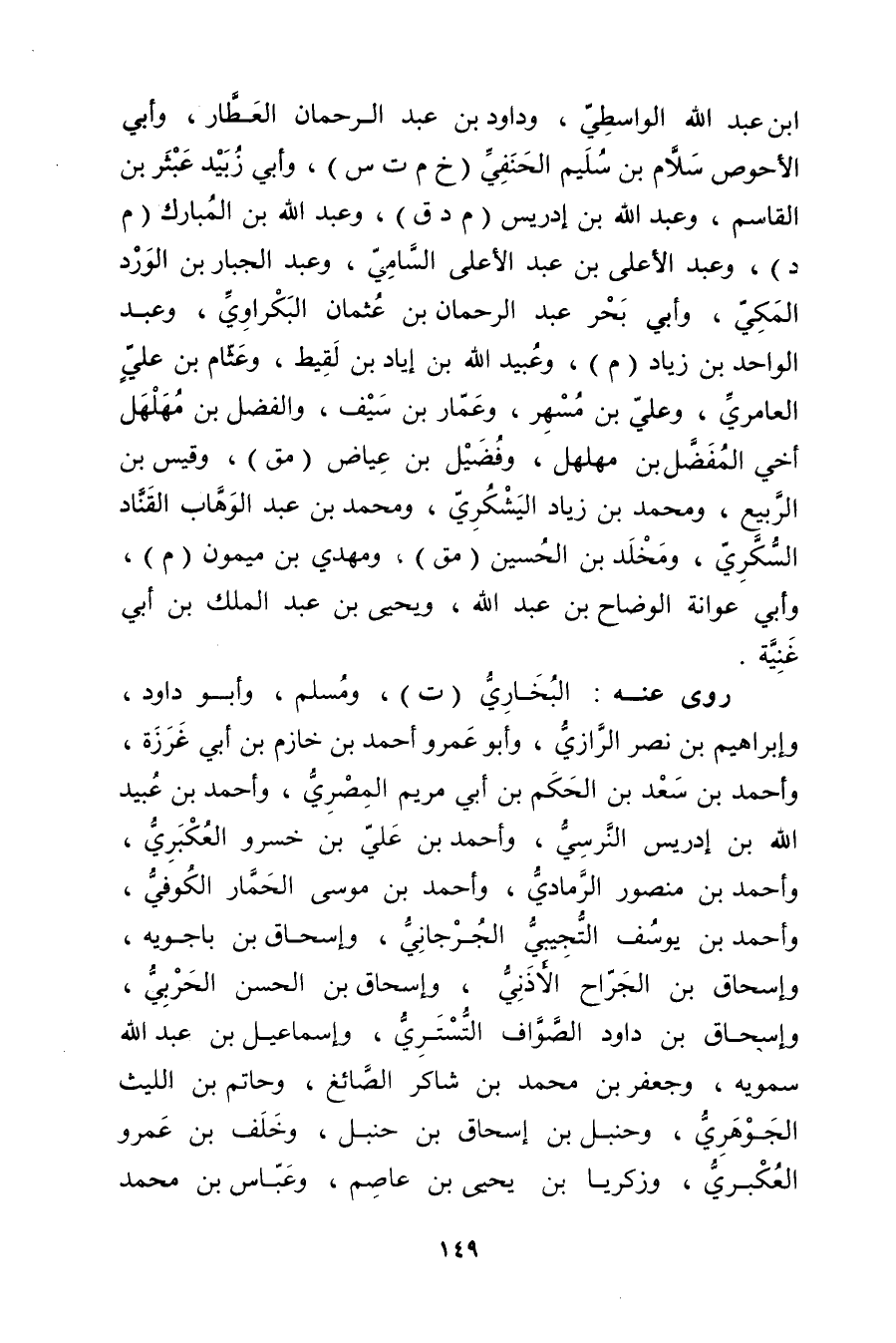 ابن عَبد الله الواسطي، وداود بْن عَبْد الرحمن العطار، وأبي الأَحوص سلام بْن سليم الحنفي (خ م ت س) وأبي زبيد عبثر بْن القاسم، وعَبْد اللَّهِ بْن إدريس (م د ق) ، وعبد الله بْن المبارك (م د) ، وعبد الاعلى بن عبد الاعلى السامي، وعبد الجبار بْن الورد المكي، وأبي بحر عَبْد الرحمن بْن عثمان البكراوي، وعبد الواحد بْن زياد (م) ، وعُبَيد اللَّه بْن إياد بْن لقيط، وعثام بْن عَلِيّ العامري، وعلي بْن مسهر، وعمار بْن سيف، والفضل بْن مهلهل أخي المفضل بْن مهلهل، وفضيل بْن عياض (مق) ، وقيس بْن الربيع، ومحمد بْن زياد اليشكري، ومحمد بْن عَبْد الوهاب القناد السكري، ومخلد بْن الحسين (مق) ، ومهدي بْن ميمون (م) ، وأبي عوانة الوضاح بْن عَبد اللَّه، ويحيى بْن عَبد المَلِك بْن أَبي غنية.
