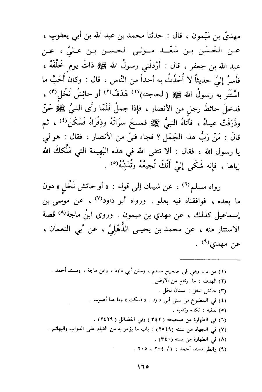 مَهْدِيُّ بْنُ مَيْمُونٍ، قال: حَدَّثَنَا مُحَمَّد بْن عَبد اللَّهِ بْن أَبي يَعْقُوبَ، عن الْحَسَنِ بْنِ سعد مولى الحسن بْن علي، عن عَبد اللَّهِ بْنِ جَعْفَرٍ، قال: أَرْدَفَنِي رَسُولُ اللَّهِ صلى الله عليه وسلم ذَاتَ يَوْمٍ خَلْفَهُ، فَأَسَرَّ إِلَيَّ حَدِيثًا لا أُحَدِّثُ بِهِ أَحَدًا مِنَ النَّاسِ، قال: وكَانَ أَحَبُّ مَا اسْتَتَرَ بِهِ رَسُولُ اللَّهِ صلى الله عليه وسلم (لِحَاجَتِهِ) (1) هَدَفٌ (2) أَوْ حَائِشُ نَخْلٍ (3) ، فَدَخَلَ حَائِطَ رَجُلٍ مِنَ الأَنْصَارِ، فَإِذَا جَمَلٌ فَلَمَّا رأى النَّبِيّ صَلَّى اللَّهُ عَلَيْهِ وسلم حَنَّ وذَرَفَتْ عَيْنَاهُ، فَأَتَاهُ النَّبِيُّ صلى الله عليه وسلم فَمَسَحَ سَرَاتَهُ وذِفْرَاهُ فَسَكَنَ (4) ، ثُمَّ قال: مَنْ رَبُّ هَذَا الْجَمَلِ؟ فَجَاءَ فَتًى مِنَ الأَنْصَارِ، فَقَالَ: هُوَ لِي يَا رَسُولَ اللَّهِ، فَقَالَ: أَلا تَتَّقِي اللَّهَ فِي هَذِهِ الْبَهِيمَةِ الَّتِي مَلَّكَكَ اللَّهُ إِيَّاهَا، فَإِنَّهُ شَكَى إِلَيَّ أَنَّكَ تُجِيعُهُ وتُدْئِبُهُ (5) .