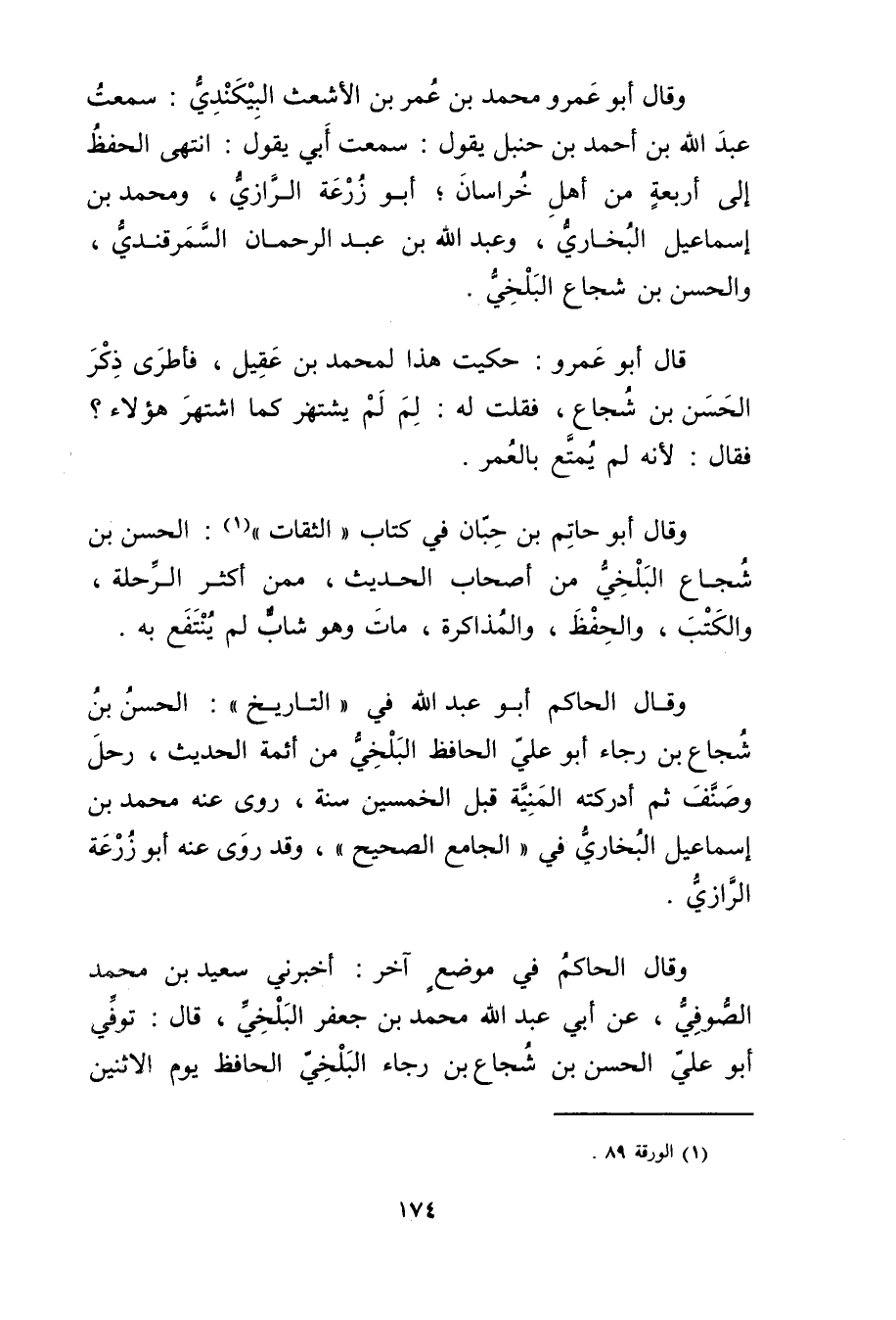 وَقَال الحاكم في موضع آخر: أَخْبَرَنِي سَعِيد بْن مُحَمَّد الصوفي، عَن أَبِي عَبد اللَّهِ مُحَمَّدِ بْن جعفر البلخي، قال: توفي أَبُو عَلِيّ الْحَسَن بْن شجاع بْن رجاء البلخي الحافظ يوم الاثنين