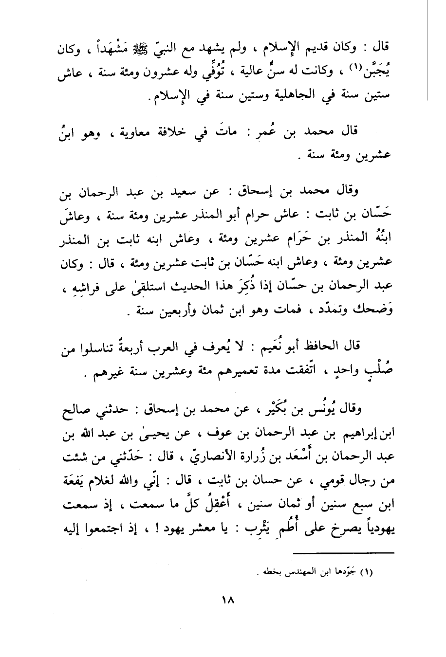 وَقَال مُحَمَّدُ بْنُ إِسْحَاقَ: عن سَعِيد بْن عَبْد الرَّحْمَنِ بْن حسان بْن ثابت: عاش حرام أبو المنذر عشرين ومئة سنة، وعاش ابنه المنذر بْن حرام عشرين ومئة، وعاش ابن ثابت بْن المنذر عشرين ومئة، وعاش ابنه حسان بْن ثابت عشرين ومئة، قال: وكان عَبْد الرحمن بْن حسان إذا ذكر هذا الحديث استلقى على فراشه، وضحك وتمدد، فمات وهو ابْن ثمان وأربعين سنة.