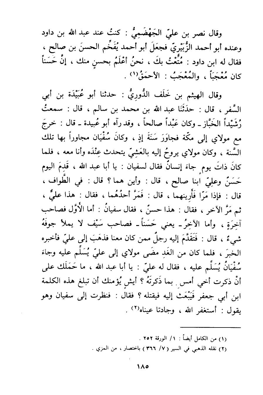 وَقَال الهيثم بْن خلف الدوري: حَدَّثَنَا أَبُو عُبَيدة بْن أَبي السفر، قال: حَدَّثَنَا عَبد اللَّهِ بْن مُحَمَّد بْن سالم، قال: سمعت رشيدا الخباز - وكان عبدا صالحا، وقد رآه أَبُو عُبَيدة قال: خرج مع مولاي إلى مكة فجاور سنة إذ، وكان سفيان مجاورا بها تلك السنة، وكان مولاي يروح إليه بالعشي يتحدث عنده وأنا معه، فلما كَانَ ذات يوم جاء إنسان فقال لسفيان: يا أبا عَبد اللَّه، قدم اليوم حسن وعلي ابنا صالح، قال: وأين هما؟ قال: في الطواف، قال: فإذا مرا فأرينهما، قال: فمر أحدهما، فقال: هذا عَلِيّ، ثم مر الآخر، فقال: هذا حسن، فقال سفيان: أما الأول فصاحب آخرة، وأما الآخر، يعني حسنا - فصاحب سيف لا يملأ جوفه شيء، قال: فتقدم إليه رجل ممن كَانَ معنا فذهب إلى عَلِيّ فأخبره الخبر، فلما كَانَ من الغد مضى مولاي إلى عَلِيّ يسلم عليه وجاء سفيان يسلم عليه، فقال له عَلِيّ: يا أبا عَبد اللَّه، ما حملك على أن ذكرت أخي أمس بما ذكرته؟ أيش يؤمنك أن تبلغ هذه الكلمة ابْن أَبي جعفر فيبعث إليه فيقتله؟ فقال: فنظرت إلى سفيان وهو يقول: استغفر اللَّه، وجادتا عيناه (2) .