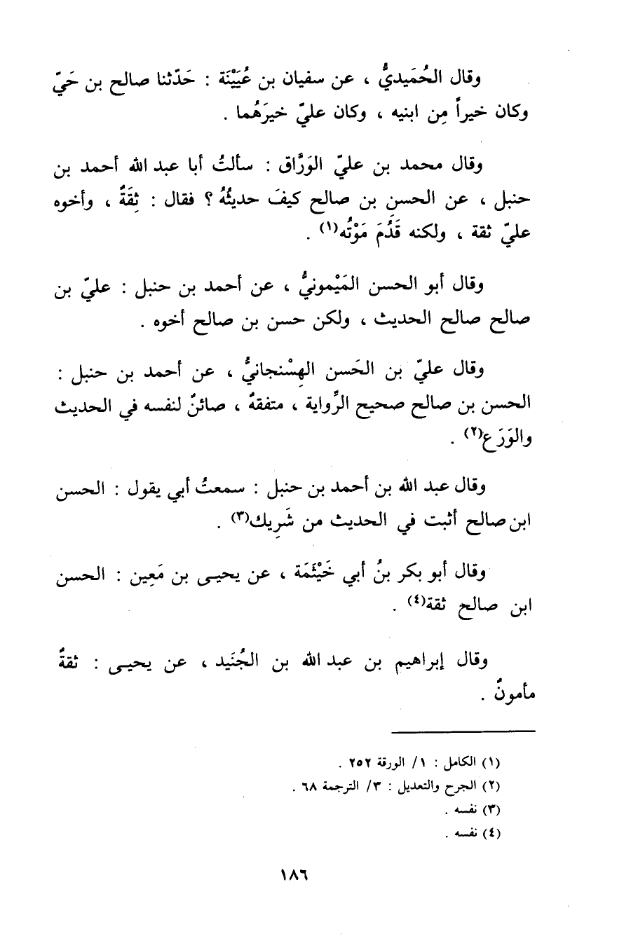 وَقَال عَلِيّ بْن الْحَسَن الهسنجاني، عن أَحْمَد بْن حنبل: الْحَسَن بْن صالح صحيح الرواية، متفقه، صائن لنفسه في الحديث والورع (2) .