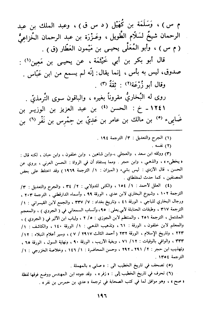 (3) ووثقه ابن سعد، والعجلي، وابن شاهين، وابن خلفون، وابن حبان، لكنه قال: يخطئ"، والذهبي، وابن حجر. ومما يستفاد أن في الرواة: الحسن العرني، يروي عن الحسن، قال الأزدي: ليس بشيءٍ (الميزان: 1 / الترجمة 1969) وقد اختلط على بعض المصنفين، كما حدث لمغلطاي.