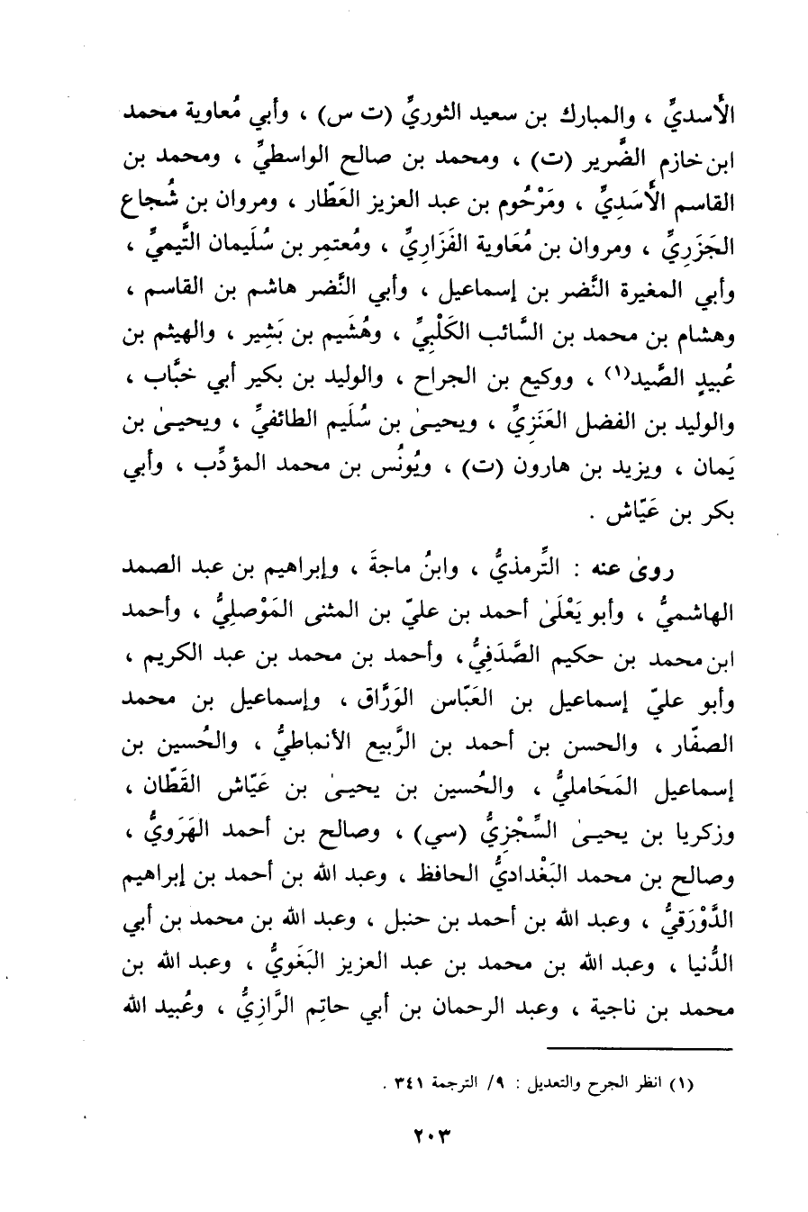 الأسدي، والمبارك بْن سَعِيد الثوري (ت س) ، وأبي معاوية مُحَمَّد ابن خازم الضرير (ت) ، ومحمد بْن صالح الواسطي، ومحمد بْن الْقَاسِم الأسدي، ومرحوم بْن عَبْد العزيز العطار، ومروان بْن شجاع الجزري، ومروان بْن معاوية الفزاري، ومعتمر بْن سُلَيْمان التَّيْمِيّ، وأبي المغيرة النضر بْن إِسْمَاعِيل، وأبي النضر هاشم بْن الْقَاسِم، وهشام بْن مُحَمَّد بْن السائب الكلبي، وهشيم بْن بشير، والهيثم بْن عُبَيد الصيد (1) ، ووكيع بْن الجراح، والوليد بْن بكير أبي خباب، والوليد بْن الفضل العنزي، ويحيى بْن سليم الطائفي، ويحيى بْن يمان، ويزيد بْن هارون (ت) ، ويونس بْن مُحَمَّد المؤدب، وأبي بَكْر بْن عياش.