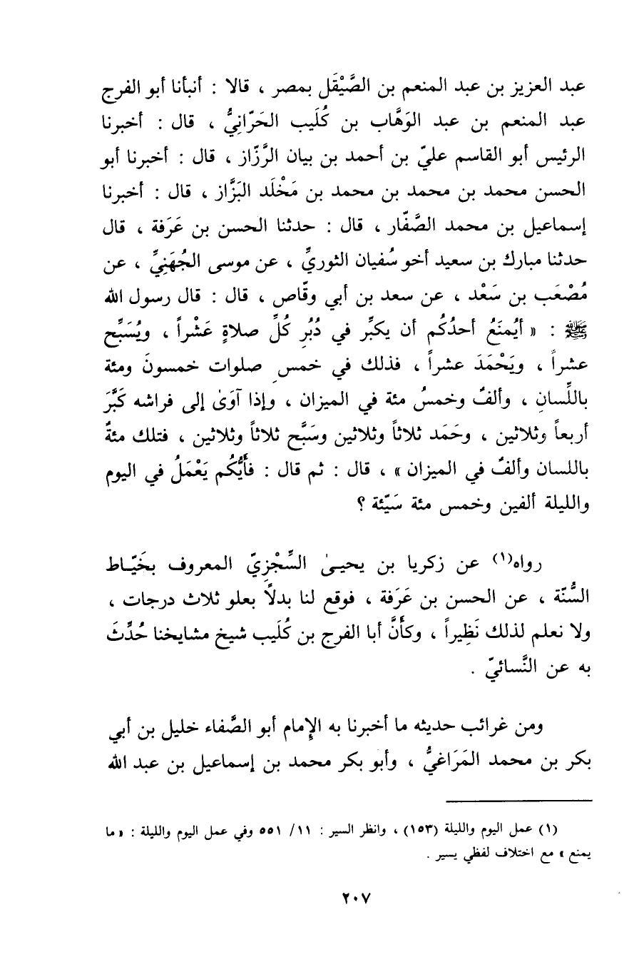 عَبْد الْعَزِيزِ بْن عبد المنعم بْنِ الصَّيْقَلِ بِمَصْرَ، قَالا: أَنْبَأَنَا أَبُو الفرج عَبْد المنعم بْن عبد الوهاب بْن كليب الحراني، قال: أَخْبَرَنَا الرئيس أبو القاسم عَلِيُّ بْنُ أَحْمَدَ بْنِ بَيَانٍ الرَّزَّازُ، قال: أخبرنا أَبُو الْحَسَنِ مُحَمَّدُ بْنُ مُحَمَّدِ بْنِ مُحَمَّدِ بن مخلد الزاز، قال: أخبرنا إِسْمَاعِيلُ بْنُ مُحَمَّدٍ الصَّفَّارُ، قال: حَدَّثَنَا الْحَسَنُ بْنُ عَرَفَةَ، قال حَدَّثَنَا مُبَارَكُ بْنُ سَعِيد أَخُو سُفْيَانَ الثَّوْرِيُّ، عن مُوسَى الْجُهَنِيِّ، عن مُصْعَبُ بْنُ سَعْدٍ، عن سَعْدِ بْنِ أَبي وقَّاصٍ، قال: قال رَسُولُ اللَّهِ صلى الله عليه وسلم: أَيُمْنَعُ أَحَدُكُمْ أَنْ يُكَبِّرَ فِي دُبُرِ كُلِّ صَلاةٍ عَشْرًا، ويُسَبِّحُ عَشْرًا، ويُحَمِّدُ عَشْرًا، فَذَلِكَ فِي خَمْسِ صلوات خمسون ومئة باللسان، وألف وخمس مئة فِي الْمِيزَانِ، وإِذَا أَوَى إِلَى فِرَاشِهِ كَبَّرَ أَرْبَعًا وثَلاثِينَ، وحَمَّدَ ثَلاثًا وثَلاثِينَ وسَبَّحَ ثَلاثًا وثَلاثِينَ، فتلك مئة بِاللِّسَانِ وأَلْفٌ فِي الْمِيزَانِ"، قال: ثُمَّ قال: فَأَيُّكُمْ يَعْمَلُ فِي اليوم والليلة ألفين وخمس مئة سَيِّئَةٍ؟