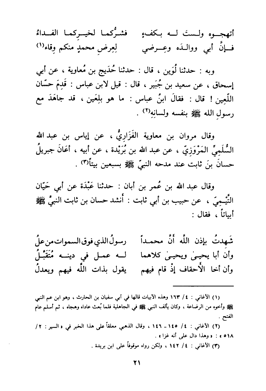 وَقَال عَبد الله بْن عُمَر بْن أبان: حَدَّثَنَا عَبْدَةُ عَن أَبِي حَيَّانَ التَّيْمِيّ، عن حَبِيبِ بْنِ أَبي ثَابِتٍ: أَنْشَدَ حَسَّانُ بْنُ ثَابِتٍ النَّبِيُّ صلى الله عليه وسلم أَبْيَاتًا، فَقَالَ: