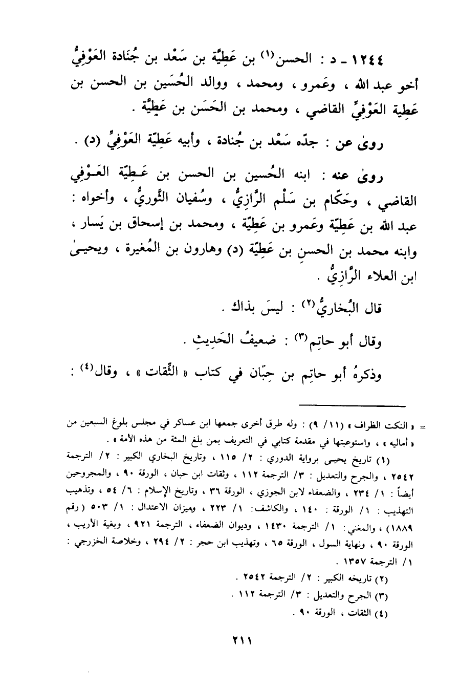 1244 - د: الْحَسَن بن عطية بن سعد بن جنادة العوفي أخو عَبد اللَّه (1) ، وعَمْرو، ومحمد، ووالد الحسين بْن الْحَسَن بْن عطية العوفي القاضي، ومحمد بْن الْحَسَن بْن عطية.