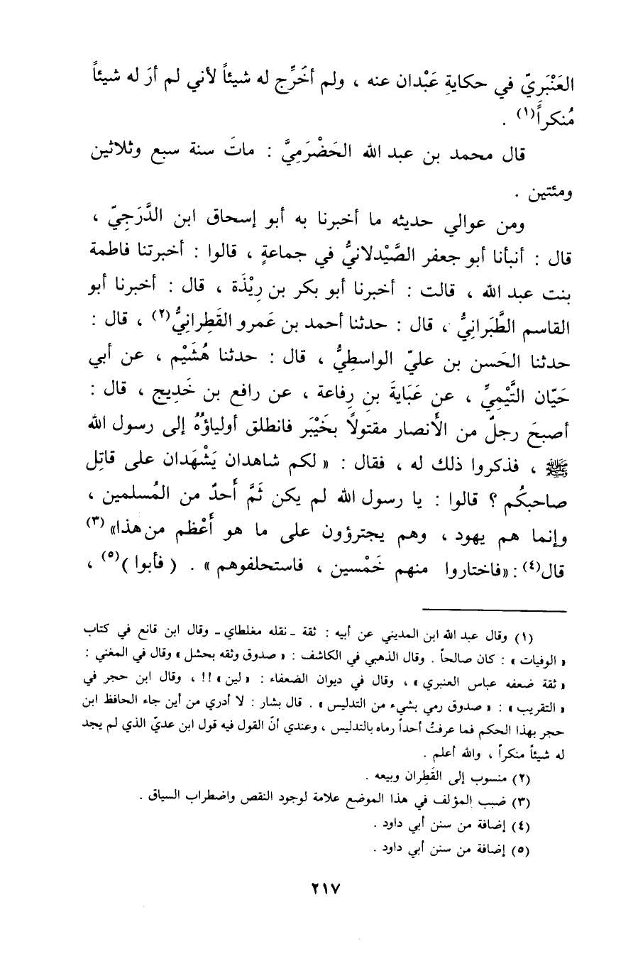 ومِنْ عَوَالِي حَدِيثِهِ مَا أخبرنا بِهِ أَبُو إِسْحَاقَ ابْنُ الدَّرَجِيِّ، قال: أنبأنا أَبُو جَعْفَرٍ الصَّيْدَلانِيُّ فِي جَمَاعَةٍ، قَالُوا: أَخْبَرَتْنا فَاطِمَةُ بِنْتُ عَبد اللَّهِ، قَالَتْ: أخبرنا أَبُو بَكْرِ بْنُ رِيذَةَ، قال: أخبرنا أَبُو الْقَاسِمِ الطَّبَرَانِيُّ، قال: حَدَّثَنَا أَحْمَدُ بْنُ عَمْرو الْقَطِرَانِيُّ (2) ، قال: حَدَّثَنَا الحسن بْن علي الْوَاسِطِيُّ، قال: حَدَّثَنَا هُشَيْمٌ، عَن أَبِي حَيَّانَ التَّيْمِيّ عن عَبَايَةَ بْنِ رِفَاعَةَ، عن رَافِعِ بْنِ خَدِيجٍ، قال: أَصْبَحَ رَجُلٌ مِنَ الأَنْصَارِ مَقْتُولا بِخَيْبَرَ فَانْطَلَقَ أَوْلِيَاؤُهُ إِلَى رَسُولِ اللَّهِ صَلَّى اللَّهُ عَلَيْه وسَلَّمَ، فَذَكَرُوا ذَلِكَ لَهُ، فَقَالَ: لَكُمْ شَاهِدِانِ يِشْهَدَانِ عَلَى قاتل صاحبكم؟ قالو: يَا رَسُولَ اللَّهِ لَمْ يَكُنْ ثَمَّ أَحْدٌ مِنَ الْمُسْلِمِينَ، وإِنَّمَا هم يهود، وهو يجترؤون عَلَى مَا هُوَ أَعْظَمُ مِنْ هَذَا" (3) قال (4) : فَاخْتَارُوا مِنْهُمْ خَمْسِينَ، فاستحلفوهم". (فأبوا) (5) ،