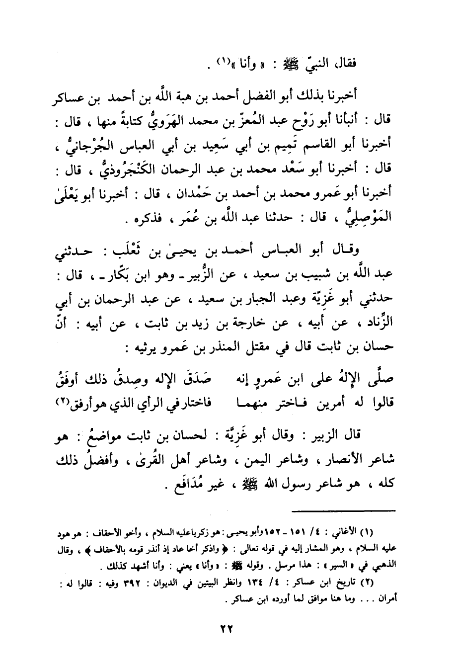 وَقَال أَبُو العباس أَحْمَد بْن يحيى بْن ثعلب: حدثني عَبد اللَّه بْن شبيب بْن سَعِيد، عن الزبير - وهو ابْن بكار، قال: حدثني أَبُو غزية وعبد الجبار بْن سَعِيد، عَن عَبْد الرحمن بْن أَبي الزناد، عَن أبيه، عن خارجة بْن زيد بْن ثابت، عَن أبيه: أن حسان بْن ثابت قال في مقتل المنذر بْن عَمْرو يرثيه: صلى الإله على ابْن عَمْرو إنه • صدق الإله وصدق ذلك أوفق