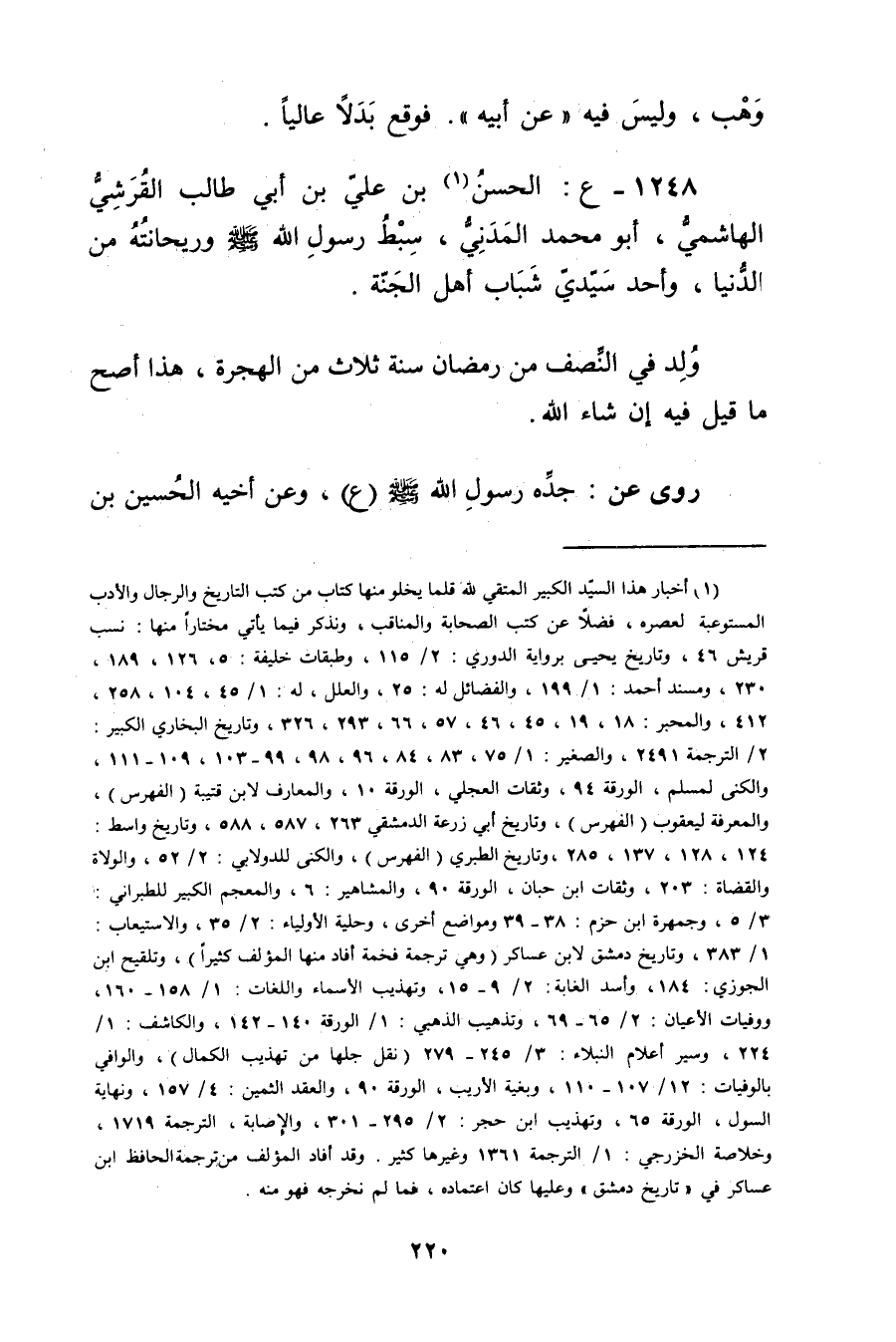 1248 - ع: الحسن بْن علي بْن أَبي طَالِب القرشي الهاشمي (1) ، أَبُو مُحَمَّد المدني، سبط رَسُول اللَّهِ صلى الله عليه وسلم وريحانته من الدنيا، وأحد سيدي شباب أهل اجنة.