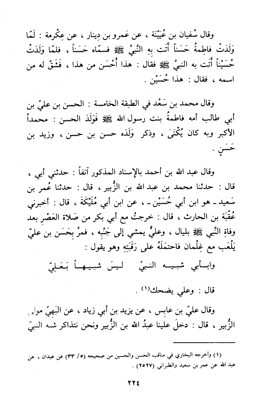 وَقَال سفيان بْن عُيَيْنَة، عَن عَمْرو بْنِ دِينَارٍ، عن عِكْرِمَةَ: لَمَّا ولَدَتْ فَاطِمَةُ حَسَنًا أَتَتْ به النبي صى الله عليه وسلم فسماه حسنها، فَلَمَّا ولَدَتْ حُسَيْنًا أَتَتْ بِهِ النَّبِيُّ صلى الله عليه وسلم فَقَالَ: هَذَا أَحْسَنُ مِنْ هَذَا، فَشَقَّ لَهُ مِنَ اسْمِهِ، فَقَالَ: هَذَا حُسَيْنٌ.