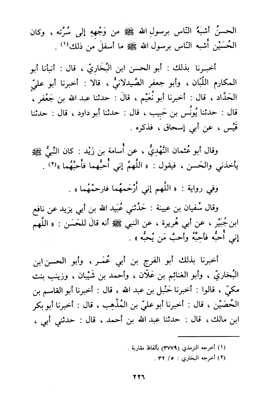 الْحَسَنُ أَشْبَهُ النَّاسِ بِرَسُولِ اللَّهِ صلى الله عليه وسلم مِنْ وجْهِهِ إِلَى سُرَّتِهِ، وكَانَ الْحُسَيْنُ أَشْبَهَ النَّاسِ بِرَسُولِ اللَّهِ صلى الله عليه وسلم مَا أَسْفَلَ مِنْ ذَلِكَ (1) .