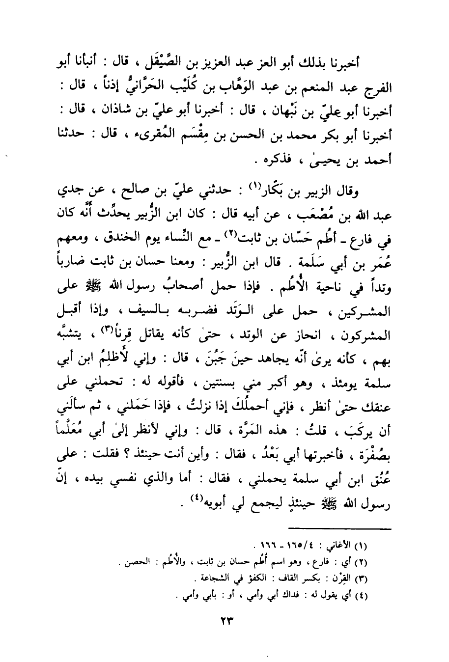 وَقَال الزبير بْن بكار (1) : حدثني علي بْن صالح، عن جدي عَبد اللَّه بْن مصعب، عَن أبيه قال: كَانَ ابْن الزبير يحدث أنه كَانَ في فارع - أطم حسان بْن ثابت (2) - مع النساء يوم الخندق، ومعهم عُمَر بْن أَبي سلمة. قال ابْن الزبير: ومعنا حسان بْن ثابت ضاربا وتدا في ناحية الأطم.