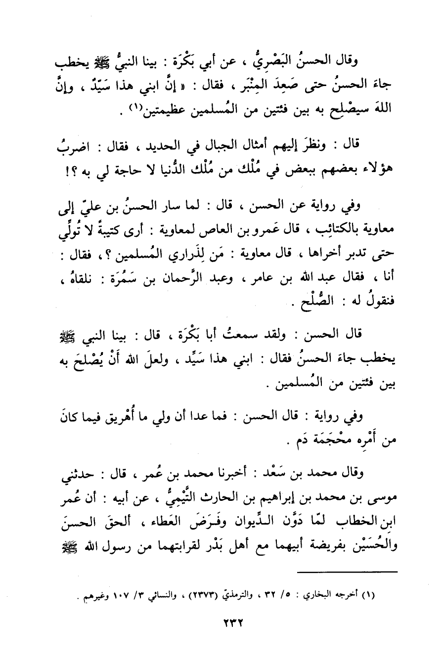 وَقَال الْحَسَنُ البَصْرِيّ، عَن أَبِي بَكْرَةَ: بَيْنَا النَّبِيُّ صلى الله عليه وسلم يَخْطُبُ جَاءَ الْحَسَنُ حَتَّى صَعِدَ الْمِنْبَرَ فَقَالَ: إِنَّ ابْنِي هَذَا سَيِّدٌ، وإِنَّ اللَّهَ سَيُصْلِحُ بِهِ بَيْنَ فِئَتَيْنِ مِنَ الْمُسْلِمِينَ عَظِيمَتَيْنِ (1) .