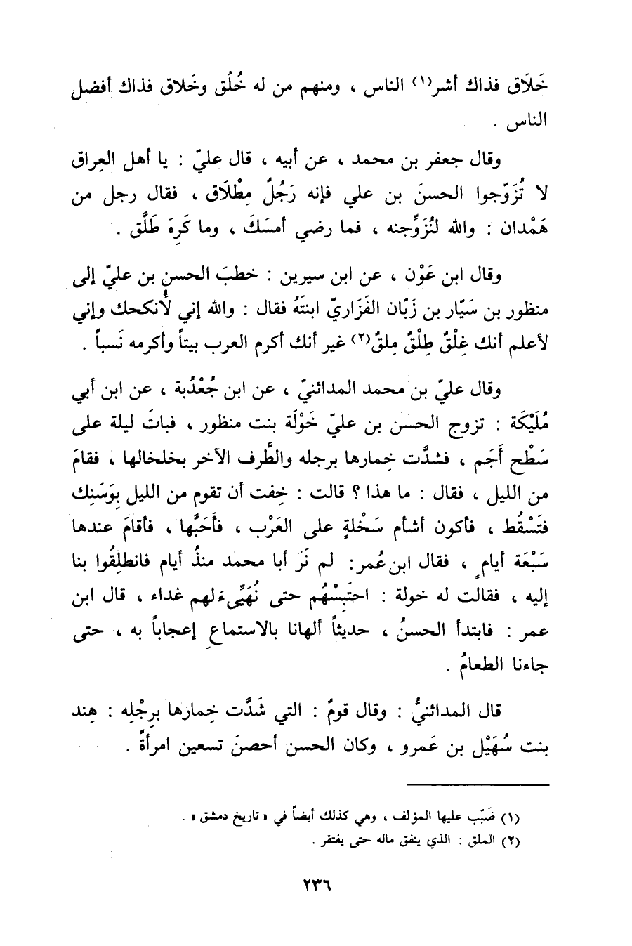 وَقَال عَلِيّ بْن مُحَمَّد المدائني، عن ابْن جعدبة، عن ابْن أَبي مليكة: تزوج الْحَسَن بْن عَلِيّ خولة بنت منظور، فبات ليلة على سطح أجم، فشدت خمارها برجله والطرف الآخر بخلخالها، فقام من الليل، فقال: ما هذا؟ قالت: خفت أن تقوم من الليل بوسنك فتسقط، فأكون أشأم سخلة على العرب، فأحبها، فأقام عندها سبعة أيام، فقال ابْن عُمَر: لم نر أبا مُحَمَّد منذ أيام فانطلقوا بنا إليه، فقالت له خولة: احتبسهم حتى نهيئ لهم غداء، قال ابْن عُمَر: فابتدأ الْحَسَن، حديثا ألهانا بالاستماع إعجابا بِهِ، حتى جاءنا الطعام.