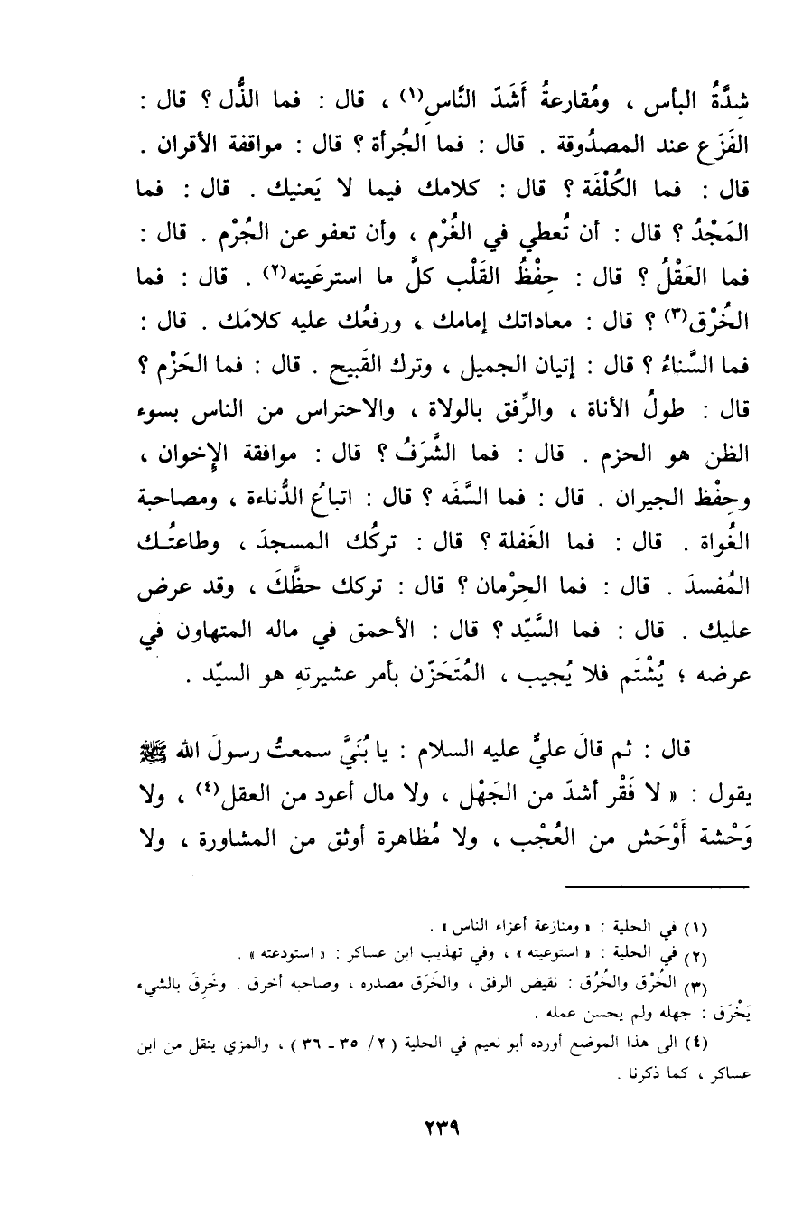 شِدَّةُ الْبَأْسِ، ومُقَارَعَةُ أَشَدُّ النَّاسِ (1) ، قال: فَمَا الذُّلُ؟ قال: الْفَزَعُ عِنْدَ الْمَصْدُوقَةِ. قال: فَمَا الْجَرَأَةُ؟ قال: مواقفة الأَقْرَانِ. قال: فَمَا الْكُلْفَةُ؟ قال: كَلامُكَ فِيمَا لا يَعْنِيكَ. قال: فَمَا الْمَجْدُ؟ قال: أَنْ تُعْطِيَ فِي الْغُرْمِ، وأَنْ تَعْفُوَ عن الْجُرْمِ. قال: فَمَا الْعَقْلُ؟ قال: حِفْظُ الْقَلْبِ كُلَّ مَا اسْتَرْعَيْتَهُ (2) . قال: فَمَا الْخُرْقُ (3) ؟ قال: مُعَادَاتِكَ إِمَامُكَ، ورَفْعُكَ عَلَيْهِ كَلامُكَ. قال: فَمَا السَّنَاءُ؟ قال: إِتْيَانُ الْجَمِيلِ، وتَرْكُ الْقَبِيحِ. قال: فَمَا الْحَزْمُ؟ قال: طُولُ الأَنَاةِ، والرِّفْقُ بِالْوِلاةِ، والاحْتِرَاسُ مِنَ النَّاسِ بِسُوءِ الظَّنِ هُوَ الْحَزْمُ. قال: فَمَا الشَّرَفُ؟ قال: مُوَافَقَةُ الأَخُوان، وحِفْظُ الْجِيرَانِ. قال: فَمَا السَّفَهُ؟ قال: اتِّبَاعُ الدَّنَاءَةِ، ومُصَاحَبَةُ الْغُوَاةِ. قال: فَمَا الْغَفْلَةُ؟ قال: تَرْكُكَ الْمَسْجِدِ، وطَاعَتُكَ الْمُفْسِدِ. قال: فَمَا الْحِرْمَانُ؟ قال: تَرْكُكَ حَظُّكَ، وقَدْ عُرِضَ عَلَيْكَ. قال: فَمَا السَّيِّدُ؟ قال: الأَحْمَقُ فِي مَالِهِ الْمُتَهَاوِنُ فِي عِرْضِهِ، يُشْتمُ فَلا يُجِيبُ، الْمُتْحَزِّنُ بِأَمْرِ عَشِيرَتِهِ هُوَ السَّيِّدُ.